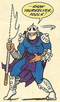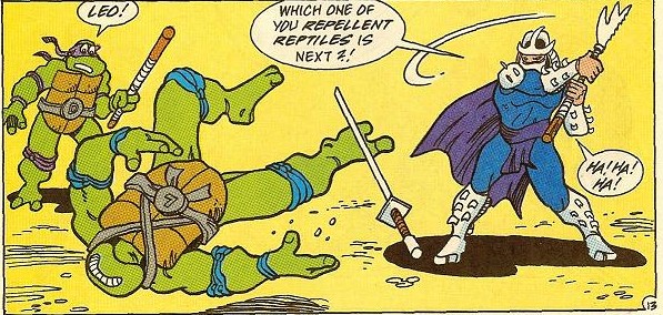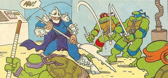 Saisissant une naginata, il les accueillait alors qu’elles enfonçaient la porte de son repaire. Restant sur leur garde, les tortues adoptaient une posture défensive contre l’homme au masque de fer, qui se moquait d’elles et les jetait au sol une à une.