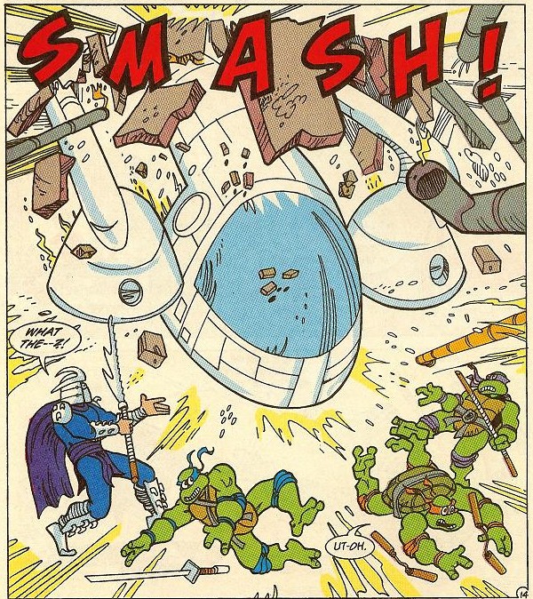 Shredder s’empressait quant à lui à scruter les recoins de la salle principale du vaisseau, à la recherche d’une arme extraterrestre lui permettant de se débarrasser des tortues. Il n’avait pas vu que Krang l’y attendait. Quand le cerveau rose se posait sur son épaule, il cherchait à amadouer son vieux bras droit, le flattant. Bellybomb se trouvait dans son dos. Au signal de Krang, le cyclope éructait au visage de Shredder. L’odeur fétide le faisait tomber dans les pommes. L’homme était placé sur une table d’opération. Krang était décidé à prendre possession de son corps, plaçant le sien sur la tête de son vieux pantin…