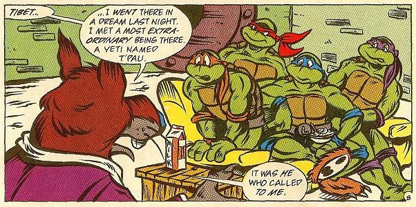 À New York, Splinter s’adonnait à sa méditation quotidienne. Mais cette fois, quelque chose d’inhabituel se produisit. L’esprit du rongeur sortit de son corps pour voyager en direction du Tibet. Arpentant le lieu enneigé, il ne tardait pas à découvrir un individu qui méditait à son tour à l’entrée d’une grotte. Même s’il s’agissait de son esprit, Splinter devait rester sur ses gardes. L’individu, bien plus grand, se nommait T’Pau, plus connu sous le surnom de yeti. C’était lui qui avait fait venir Splinter. Une menace pesait sur la Terre, et venait d’arriver en ces lieux reculés et généralement désertés. Il l’invitait à s’entretenir avec lui dans ses appartements, au fond d’une grotte.
