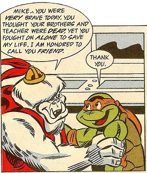 Tout en s’asseyant, le rat ne cachait pas ignorer la raison ce qui avait poussé T’Pau à l’invoquer. Le Yeti lui révélait que sa réputation, ainsi que celle de ses élèves les Tortues Ninja, l’avait précédé. Il était très inquiet, car de puissantes forces de vies avaient cessées de communiquer avec lui depuis quelques temps, en Écosse, dans les forêts du nord du Canada ou encore dans l’Océan Atlantique. Depuis les flammes du feu qui réchauffait la cavité, il lui présentait la silhouette de l’ennemi qu’il redoutait le plus, mais dont il ignorait tout pour le moment. Splinter l’aiderait, mais ils allaient avoir besoin de temps. La route pour le Tibet était longue, et ils devaient encore se préparer. Il reviendrait au plus vite avec ses fils.