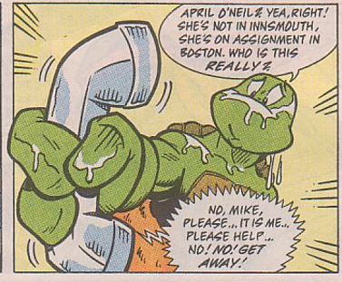 La jeune femme se relevait et laissait la petite fille sur le trottoir, tournant le dos à ses avertissements. Le jour se levait et bientôt une horde de zombies, les habitants, se lançaient à la poursuite de la journaliste. Où qu’elle aille, ils étaient après elle. April se réfugiait dans une ruelle, entre des poubelles. Son ventre continuait de lui faire mal. Après quelques minutes, elle n’entendait plus rien. Regardant à travers la rue principale, elle apercevait une cabine téléphonique et s’empressait d’y entrer pour appeler les tortues. Michaelangelo décrochait, un poil grincheux car il sortait de la douche. La communication était très mauvaise et la tortue ne comprenait pas qu’il s’agissait d’April. Il pensait plutôt à un canular. Soudain, plus rien. Le téléphone de la cabine Les tortues s’entraînaient dans le dojo. Splinter demandait à son fils, lorsqu’il les rejoignait, qui les avait contactés. Le reptile expliquait le canular auquel il venait d’assiter. Ses frères comprenaient immédiatement que ce n’était pas une farce et que leur amie était bien en danger. Personne d’autre n’avait leur téléphone !