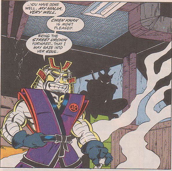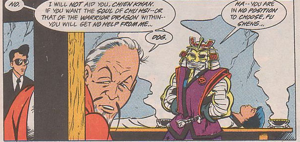 Elle était amenée dans des entrepôts le long des quais. Elle faisait face à un individu revêtu d’une armure de samurai. Son visage était protégé par un kabuto et un masque. Il se faisait appeler Chien Khan. Un autre individu était tapi dans l’ombre, sur une caisse. Fu Sheng était attaché à un poteau de bois. Il ne voulait pas que ses ravisseurs touchent à la fille. En réalité, Khan en avait après Chu Hsi, dont le corps était déposé sur une table, encore endormi. Il convoitait la puissance du warrior dragon. Le vieil homme refusait de l’aider dans cette quête.