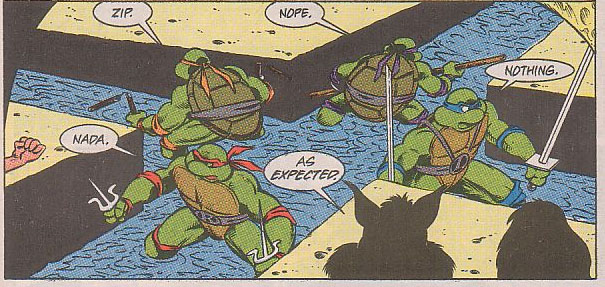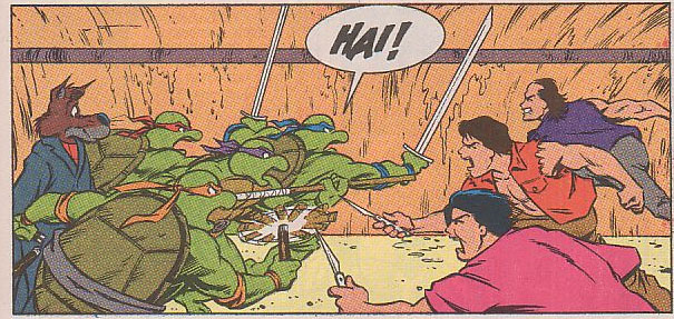 Une fois l’avion posé, les cinq mutants et April devaient trouver un moyen de sortir de l’aéroport. Soudain, un vigile les surpris. La jeune femme intervint, lui expliquant qu’ils étaient des acteurs pour une émission américaine. L’homme reconnut la journaliste, et leur demanda un autographe, avant de les conduire à « leur limousine ». Afin d’éviter d’autres ennuis, les amis continuèrent leur route à travers les égouts. Donatello était surpris de voir à quel point ils semblaient récents par rapport à ceux de New York, alors que la ville japonaise était plus ancienne. Chemin faisant, le rat expliquait à ses fils que la ville entière avait été reconstruite à la suite de la Seconde guerre mondiale. Mais c’est alors qu’ils rencontrèrent un groupe de jeunes hommes brandissant des couteaux.