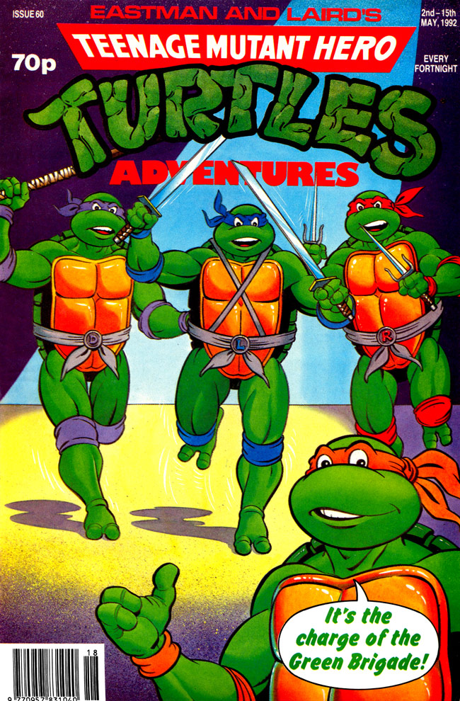 - Couverture magazine « Teenage Mutant Hero Turtles #60 », Fleetway (Grande-Bretagne, 1992) – Dessinateur inconnu. Édition britannique sortie entre le 2 – 15 mai 1992.