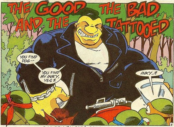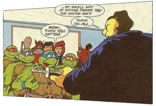 - Le personnage de Tattoo est très peu présent dans TMNT Adventures. Son introduction servait certainement à appuyer les ventes de sa figurine, sortie l’année précédente chez Playmates Toys.