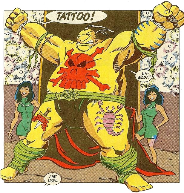 Après le combat contre Raphael et Ninjara (TMNT A. #31), l’un des hommes se faisait enfin entendre par les tortues. Ils venaient leur demander de l’aide pour leur ami Tai San, qui ne devait plus tarder à arriver. Soudain, dans un bruit de fracas, une moto faisait irruption, conduite par un homme à la carrure colossale. Il s’agissait de Tai San, plus connu sous le surnom de Tattoo. Il brandissait une photo d’Inky, son petit chien qui avait été enlevé. Voilà pourquoi les tortues avaient été sollicitées. Le message des ravisseurs demandaient à Tattoo de perdre son prochain combat. Dans le cas contraire, son chien serait abattu. Dans tous les cas, le lutteur avait beaucoup à perdre. Leonardo proposait de former deux équipes. Une première se chargerait de secourir Inky pendant le combat de sumo. La seconde veillerait sur Tai San qui risquerait de subir les représailles des ravisseurs, les frères Yen.