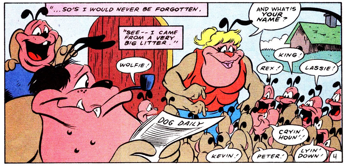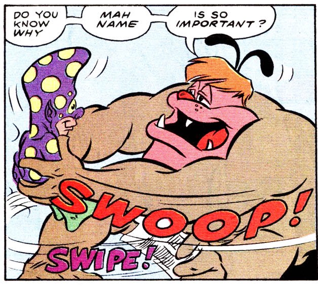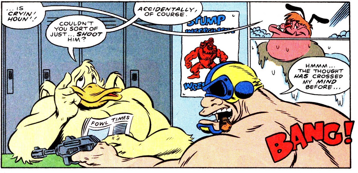 Stump et Sling étaient à la recherche d’Ace Duck et de Trap. Ils avaient un nouveau catcheur en devenir à former. Ils ne connaissaient même pas son vrai nom. Les deux amis avaient clairement autre chose à faire, et s’esquivaient de la pièce, laissant le petit Nobbie Bulkhead seul… Avec Cryin’ Houn’ qui continuaient de crier son nom tout en sortant de la douche.