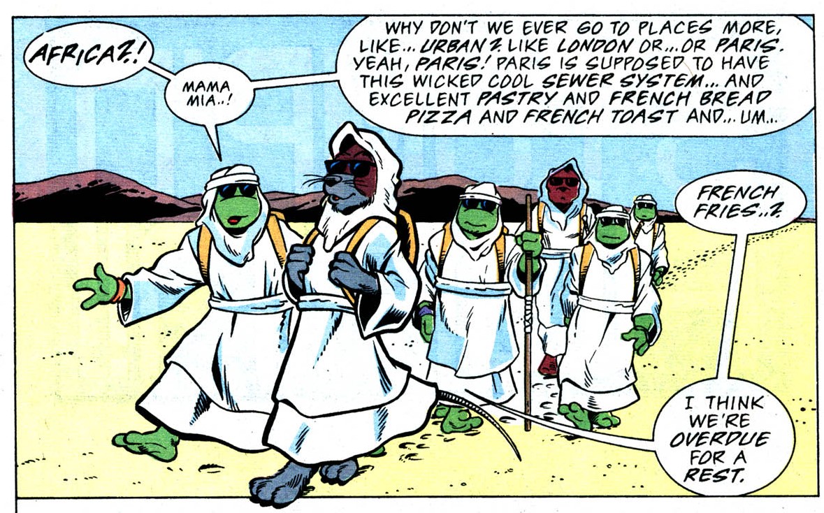 Les six compagnons arpentaient le désert. D’après Splinter, ils arriveraient une semaine plus tard dans le désert africain. Mais les tortues étaient épuisées. Ils faisaient une pause à l’ombre d’un tissu dressé entre quatre pieux de bois plantés dans le sable. Pouvant enfin se reposer, les quatre reptiles ninjas se posaient des questions par rapport à leur dernier combat (TMNT A. #36). Qui était ce mystérieux Verminator X ? Venait-il vraiment du futur ?