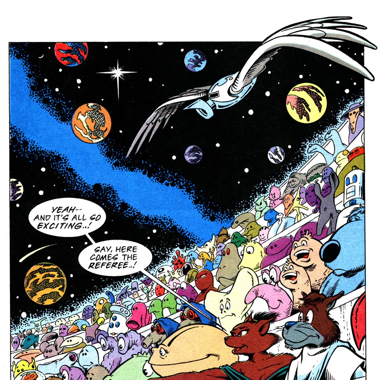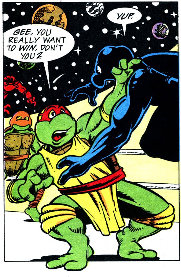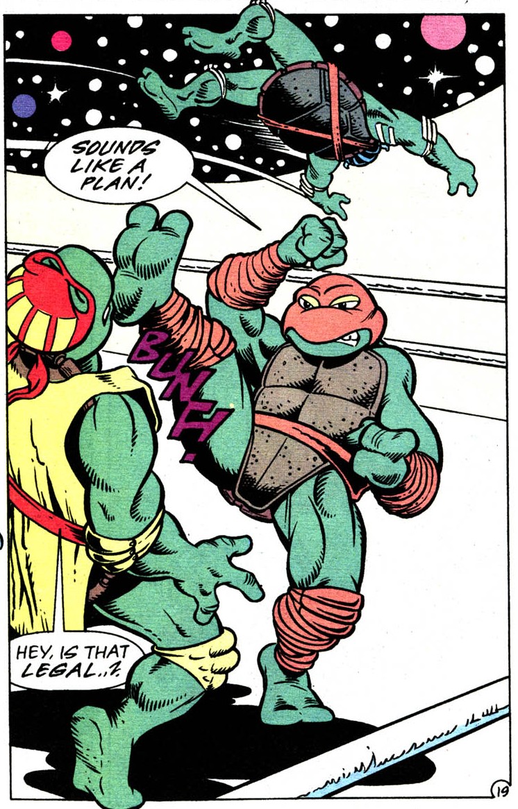Après un voyage à travers la dimension, les tortues, Splinter et Ninjara arrivaient sur l’astéroïde. Raphael se montrait toujours aussi agressif que la première fois avec Stump (TMNT A. #7) et voulait savoir ce qu’ils faisaient là. L’arbre d’affaires leur proposait de participer au prochain tournoi de catch. C’est que les reptiles avaient plu au public ! En échange, il leur proposait de voyager où ils voulaient et à l’époque qu’ils désiraient à l’aide de Cudley. Une fois encore, Stump était le grand gagnant de leur marché au vu de la somme folle qu’il risquait d’engranger. Ninjara et Splinter prenaient un malin plaisir à voir les quatre ninjas tournés en dérision. Ils voulaient partir du désert ? Qu’ils en assument les conséquences ! Leurs costumes se trouvaient dans les vestiaires. Le premier combat débutait deux heures plus tard.