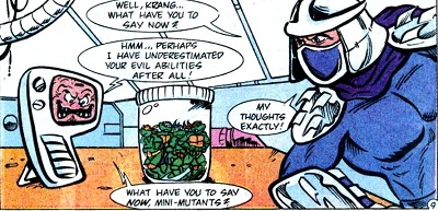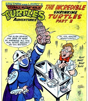 De retour dans les égouts, les mutants s’impatientaient du retour de Michaelangelo, avec des pizzas. La tortue revint les bras chargés de quatre boîtes, qu’il disposait sur la table de la cuisine. À la grande surprise de ses frères, elles étaient minuscules, ce qui étonnait (et décevait) beaucoup les pizzavores. C’était une idée de Splinter !