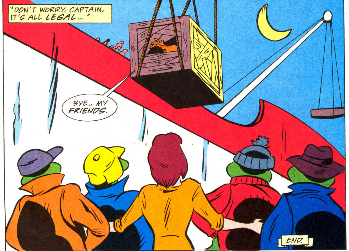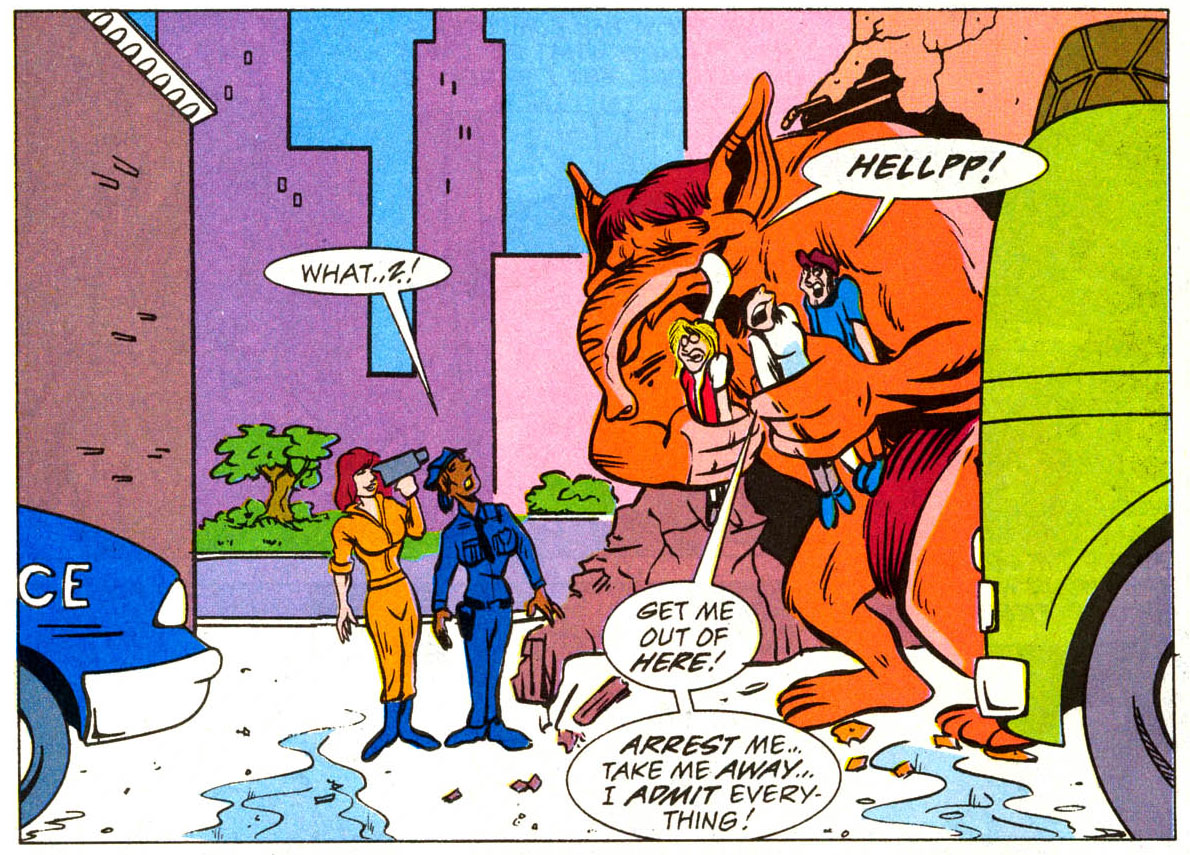 Après l’incident, April était entendue par une policière qui recueillait son témoignage. Soudain, une main sortait des décombres. Il s’agissait de Manmoth, qui tenait entre ses mains le Dr. Davis et ses deux larbins, qu’il remettait à la police. La femme en uniforme ne savait plus quoi penser de tout cela. Et ne voulait pas trop poser de questions face à l’imposante créature. April se proposait de la faire disparaître.