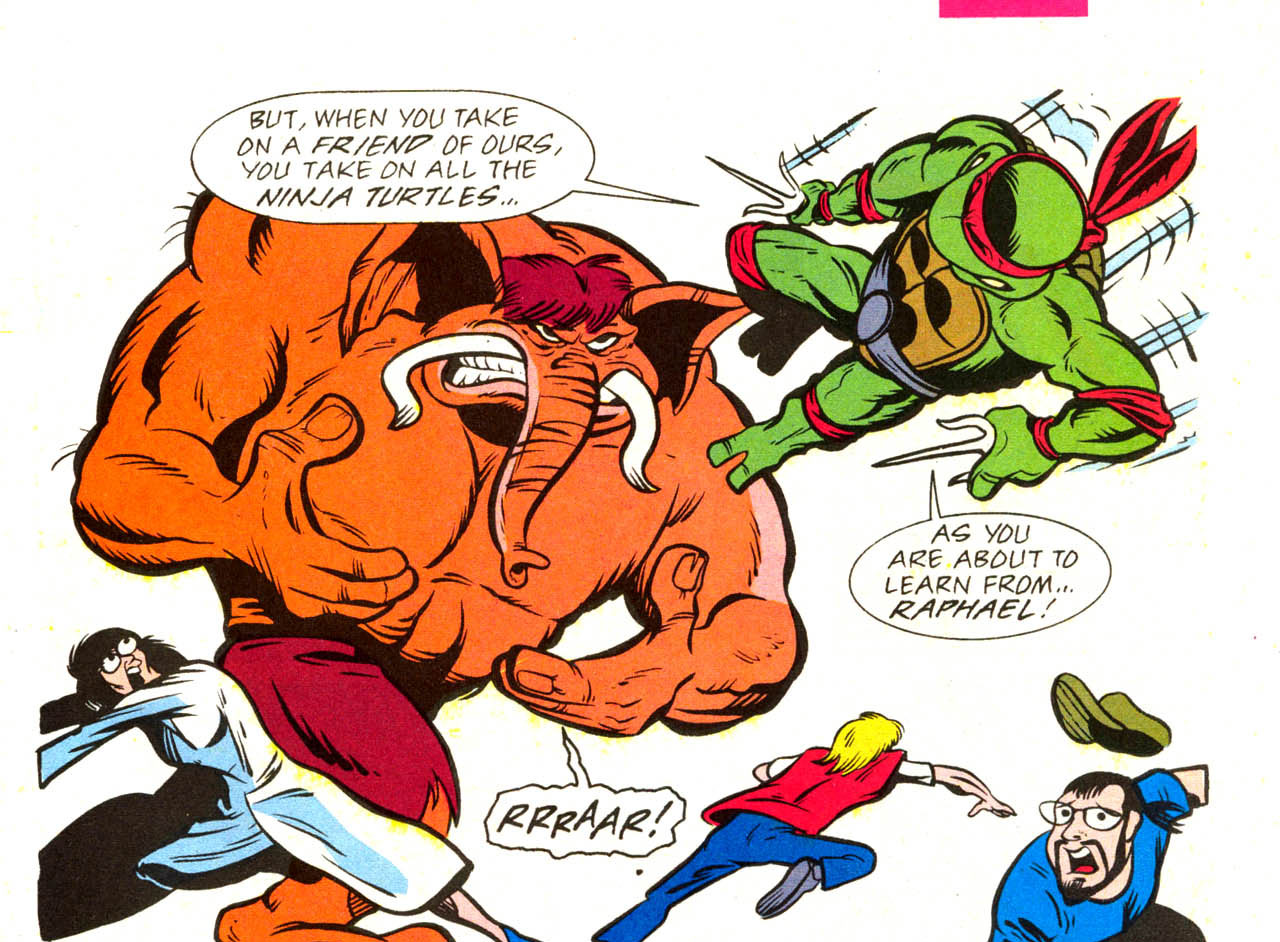- Au moment de la publication de ce numéro, Manmoth n’était pas apparu dans l’ongoing des TMNT Adventures. Son aventure intitulée Origin of the species avait été publiée dans le TMNT meet Archie #1. Elle sera par la suite rééditée comme seconde histoire dans le TMNT A. #71.