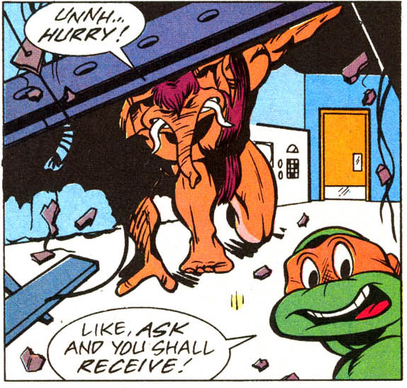 Dans sa colère, il désactivait le système de sécurité, ouvrant la cage où le Manmoth originel était retenu prisonnier. Furieux de ce qui lui arrivait, le mutant fondait sur son clone pour l’envoyer voler à travers les pièces. Le laboratoire menaçait de s’effondrer. Manmoth arrêtait une poutrelle qui s’effondrait sur son dos. Le temps pour les tortues et April de s’échapper du lieu qui s’effondrait totalement.