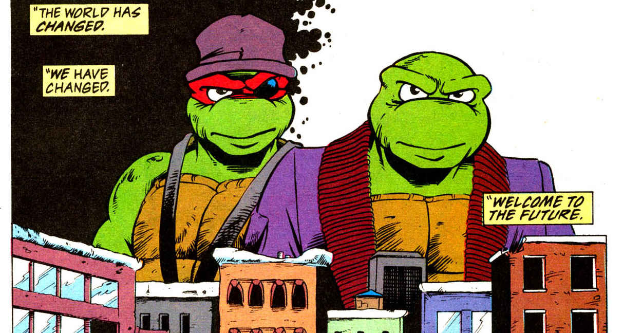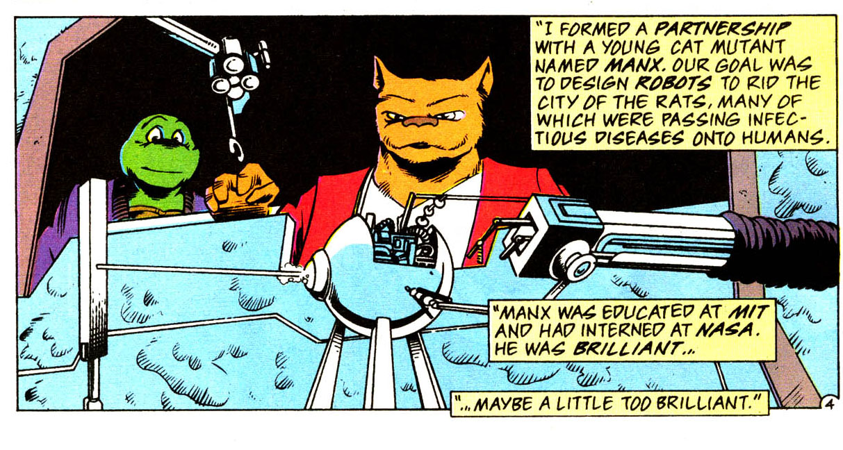 Au sommet d’un immeuble, regardant dans le vide, le Donatello du futur terminait son discours d’explications aux visiteurs venus du passé. Il faisait un constat accablant. Toutes les prédictions sur un avenir critique s’étaient réalisées. L’effet de serre avait fait fondre une partie des glaciers, déversant les eaux des océans dans les villes côtières. New York n’avait pas été épargnée. Les égouts inondés, des millions de rats vinrent chercher refuge à la surface, inquiétant la population, en proie aux maladies. En réponse à ce problème, Donatello s’était associé à un étudiant sortant du MIT pour fabriquer des robots capables d’endiguer cette invasion. Un chat mutant du nom de Manx. Un esprit extrêmement brillant. Un petit peu trop d’ailleurs…