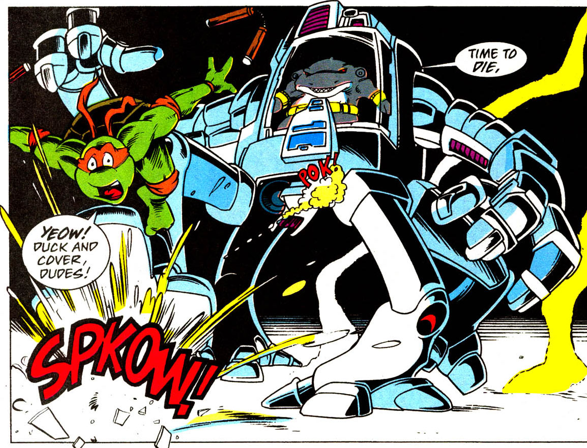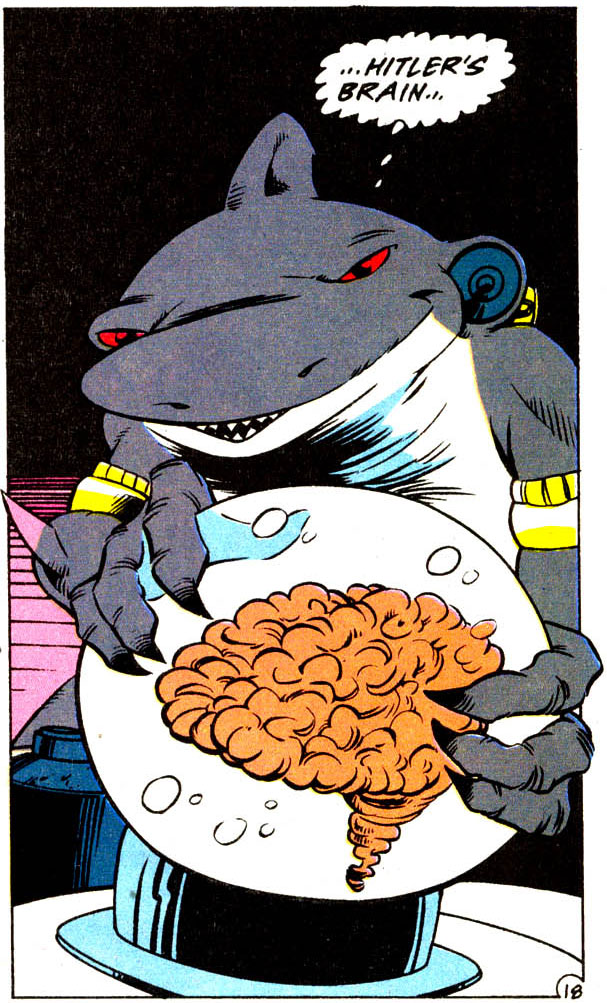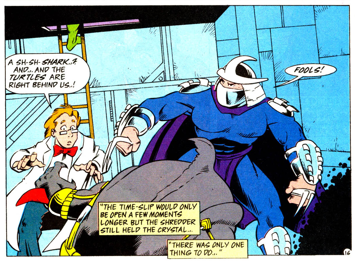 Armaggon installait des barils de matières radioactives à proximité du générateur temporel tout en se remémorant l’aventure qui l’avait conduite jusqu’ici. Sa discussion avec un chat mutant rencontré dans un bar, qui lui parlait des fragments de l’œil de Sarnath. Son voyage dans le temps pour retrouver Shredder, qui venait d’échouer face aux tortues (TMNT A. #4). Après une brève altercation, le requin lui avait expliqué l’importance de sa mission et lui proposait de l’accompagner à son époque. À peine avaient-ils franchit le portail qu’il explosait. La nouvelle version dérobée serait bien plus performante. Elle fonctionnait grâce aux déchets nucléaires de M. Null, des os des extraterrestres de Roswell, le cerveau d’Hitler et la pierre blanche de la Mecque (TMNT A. #36)…