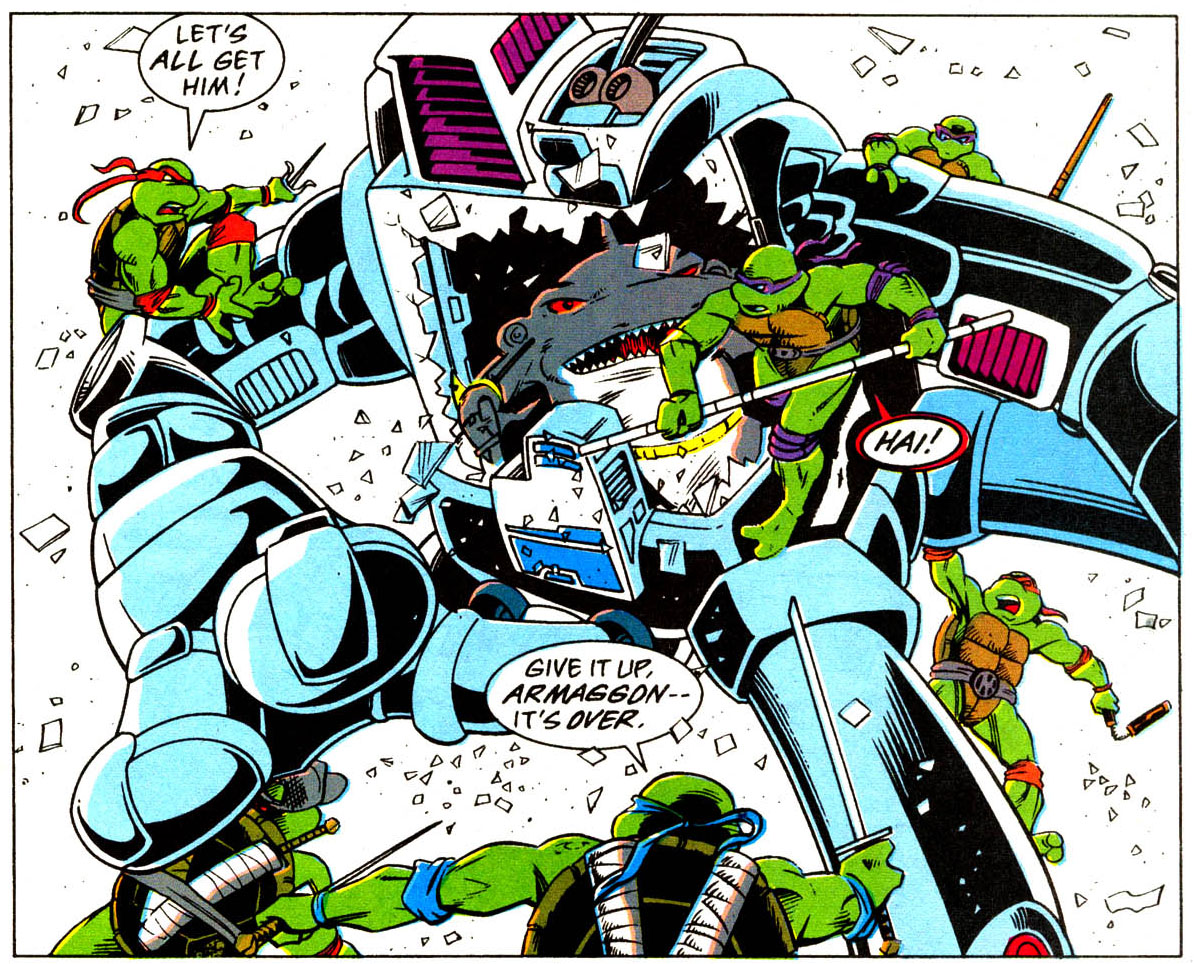 Donatello terminait de préparer son portail. Son équipe était prête à voyager dans le temps pour empêcher leurs ennemis de remporter la bataille. Au même moment, Verminator-X tendait la pierre blanche au requin, qui la plaçait dans la machine. Tout était en ordre pour ouvrir un nouveau portail. Mais contre toute attente, celui-ci s’activait et laissait apparaître les tortues, Splinter et Ninjara. Les reptiles semaient la panique dans les rangs de leurs ennemis. Les deux Donatello se prêtaient main forte pour venir à bout de Verminator-X. Mais Armaggon n’avait pas dit son dernier mot. Il s’était construit un robot mecha qui s’attaquait aux envahisseurs. Les jeunes tortues bondissaient sur la machine pour l’arrêter. Encerclé, le requin sautait de son appareil et bondissait sur Leonardo. Il l’emportait à travers le portail temporel, resté ouvert.