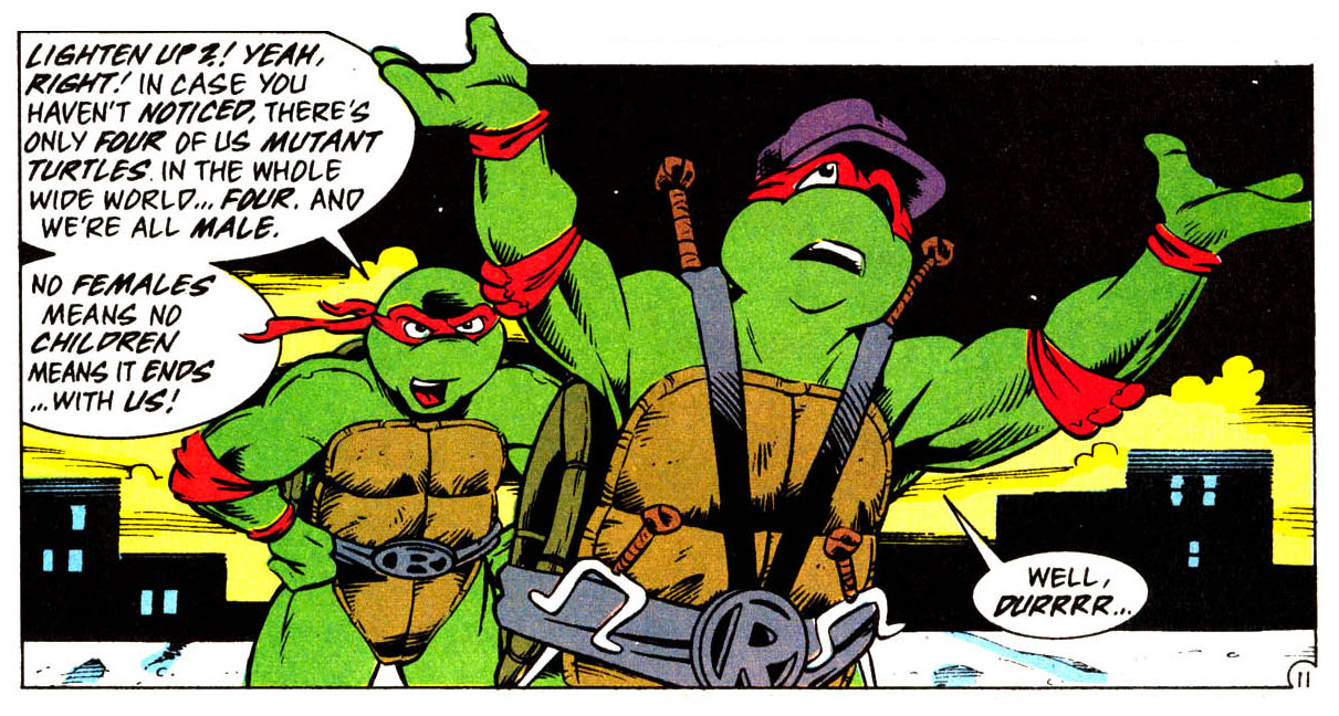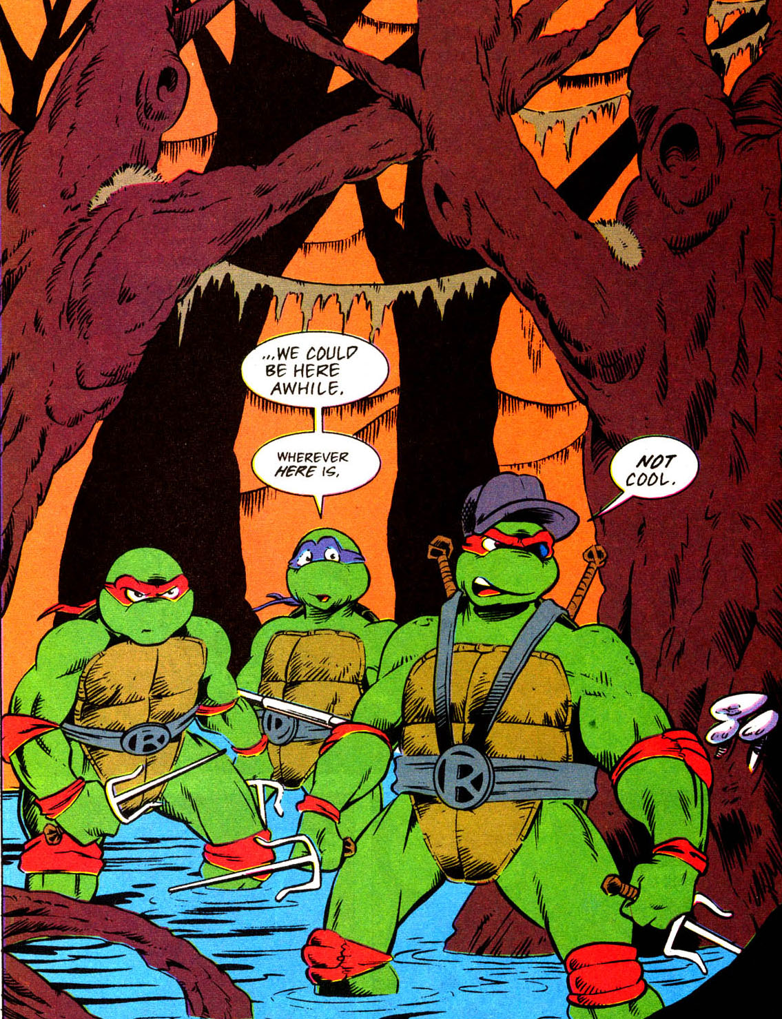 Si les autres reptiles les suivaient, leur frère était mort. Pour s’assurer que personne ne les suive, Armaggon tirait une torpille qui s’écrasait dans le générateur. Le portail se refermait. Les deux Raphael et le jeune Donatello s’étaient tout de même lancés à leur poursuite. Ils apparaissaient dans une sorte de forêt inondée. Le portail se refermait sur la jambe de Raphael, qui avait à peine le temps de la sortir du portail. Ils ne pouvaient plus faire demi-tour…
