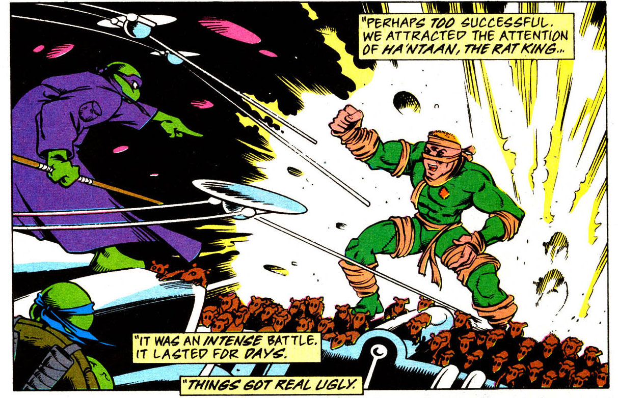 Les premiers prototypes, qui deviendraient les ornicoppers, décimaient les rongeurs. Les premières semaines étaient un franc succès. Mais très vite, ce massacre fit sortir le rat de sa tanière. Ha’Ntaan, le Rat King. Il leur livra un combat féroce des jours durant. Les tortues remportèrent la bataille, le contraignant à se replier dans les bas-fonds de la ville.