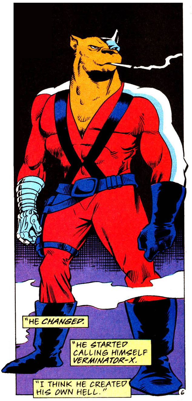 Cette victoire sur les rats rendit Donatello et Manx très riches, leur ouvrant la porte sur de nouvelles voies. Une pure réussite qui poussa le chat à poursuivre ses recherches sur la biomécanique ; jusqu’à essayer ses résultats sur lui-même. Il s’implanta des circuits dans le cerveau et disait rechercher l’immortalité. Petit à petit, Manx se mit à changer et jusqu’à se faire appeler Verminator X. Il prétendait s’être créé lui-même. Puis commença à ne plus respecter la loi. Seules ses intentions comptaient réellement.