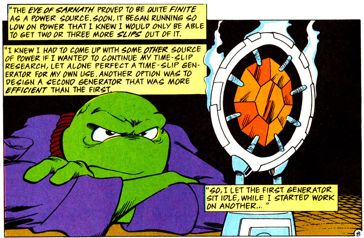 Avec le départ de Manx, Donatello se concentra sur ses propres recherches, principalement le voyage dans le temps. Il avait énormément appris de Cudley. Notamment qu’il aurait besoin d’une immense source d’énergie. Donatello se lança alors à la recherche du deuxième fragment de Sarnath. Shredder en possédait un, mais il était hors de question de l’affronter. Les recherches de la tortue étaient interminables. Elle dut se rendre à l’évidence et subtiliser le premier. Les essais avec la machine de Donatello étaient concluent. Il parvenait à faire passer une pomme dans un portail et la faire ressortir dans un autre au bout de quelques secondes. Mais la puissance du fragment de Sarnath n’était pas inépuisable. Face au mur, le génie n’avait plus qu’une option, construire un nouveau générateur de brèche temporelle plus performant pour s’émanciper du cristal.