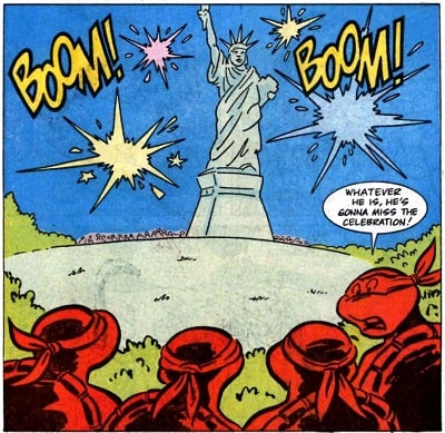 Shredder et ses mutants se trouvaient à bord d’un sous-marin à proximité de New York. L’homme au masque de fer passait un sale quart d’heure. Krang venait d’apprendre que Bebop et Rocksteady avaient perdu un baril de mutagène dans les égouts. Son précieux et si rare mutagène. Il espérait que les deux imbéciles soient sévèrement punis. Shredder avait quant à lui un projet pour saboter la fête nationale des newyorkais…