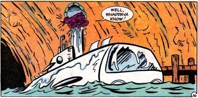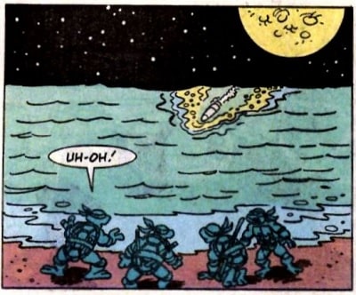 À proximité de la statue de la liberté, l’ombre s’apprêtait à mettre à bien son plan, pour contrecarrer celui de Shredder. Plongeant dans les profondeurs de l’océan, il se dégota un harpon qui gisait sur le sable. Il tirerait sur la brique de plastic et ferait sauter le sous-marin.Si l’idée paraissait bonne, il était loin de s’imaginer que les tortues étaient à bord. Les quatre mutants étaient soudain surpris par Bebop et Rocksteady. Donatello poussa le rhinocéros, qui planta sa corne dans la paroi du submersible. De l’eau s’infiltrait à très grande vitesse, ils coulaient. Shredder prit la fuite, seul, tandis que ses acolytes le suppliaient de revenir. Michaelangelo et Donatello saisirent des bouées pour secourir les deux imbéciles, coincés en revenant à la surface. Les tortues regagnaient le rivage à la nage.