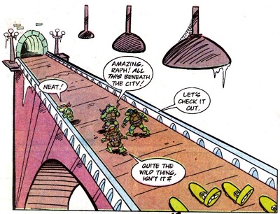 Les tortues se dirigeaient, à bord de leur cheapskates, en direction d’un pont gigantesque dans les égouts découvert part Leonardo. La tortue voulait le montrer à ses frères. Observant la structure monumentale, les ninjas ne s’étaient pas aperçus que Bebop et Rocksteady les y attendaient, jetant leurs appareils par-dessus bord.