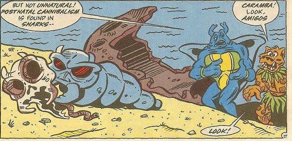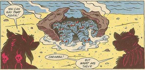 Regardant au fond du rocher, ils virent un dernier ver en train de se régaler des restes de l’un de ses frères, avant de s’en aller retrouver le reste des siens. Ils avaient déjà massacrés quelques arbres sur leur chemin. C’en était trop pour Jagwar, dont la perte des arbres était un vrai crime (TMNT A. #14). Criant sur les créatures, celles-ci se retournèrent vers lui et ses amis.