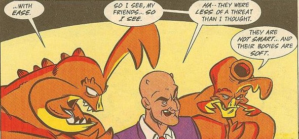 Cudley avait ramené Stump et Sling sur l’astéroïde du catch. Le plan de Maligna révélé, Leatherhead désirait repartir sur Terre pour empêcher la reine des insectoïdes de la détruire. Wingnut et Screwloose étaient du même avis. Même s’ils n’aimaient pas particulièrement cette planète, ils n’allaient pas laisser un énième seigneur de guerre détruire des civilisations entières (TMNT A. #8).