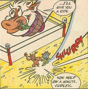 Mais pour leurs directeurs, il était hors de question qu’ils s’en aillent. Outre le fait que cette guerre leur rapporterait gros, ils ne tenaient pas à laisser leurs lutteurs s’en aller et risquer leur vie pour autre chose que du catch. Sans crier gare, la vachette saisit ses amis et les emmena au plus vite sur Terre, sous le regard effaré de Sling et de Stump, criant à la trahison. En plein voyage, Cudley fut touché par quelque chose et perdit connaissance…
