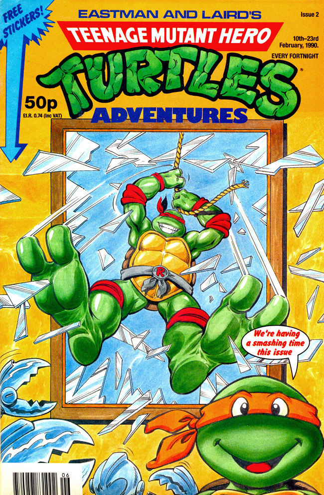 - Couverture magazine « Teenage Mutant Hero Turtles #2« , Fleetway (Grande-Bretagne, 1990) – Dessinateur inconnu. Édition britannique sortie entre les 10 et 23 février 1990.