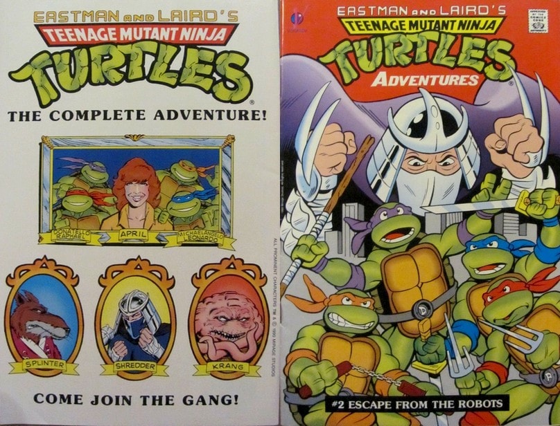 - Tundra Publishing, qui a réédité une partie des TMNT Adventures au début des années 90′, n’a pas pris la peine de rééditer ces premières aventures, qui sont adaptées du scénario de David Wise, sur le dessin animé de 1987. Plus récemment, en 2012, IDW Publishing a réédité ces trois aventures sans apporter la moindre modification sur les couleurs et le texte. Il s’agit en réalité d’une adaptation d’un numéro sorti chez Archie Comics en 2009, à l’occasion des 25 ans de la licence. À cette occasion, Archie avait demandé à Michael Dooney une couverture exclusive. Sur son blog, l’artiste confie avoir été surpris de voir qu’elle avait été modifiée pour sa version finale, à travers des couleurs ravivées, et surtout le changement de place de la lune. Afin qu’elle ne soit pas cachée par le titre, elle fut descendue derrière les immeubles. Dooney ne cache pas son regret de ne pas avoir été contacté pour faire ces changements lui-même, et ne les a appris qu’au moment de la sollicitation de ce numéro, fin février 2009.