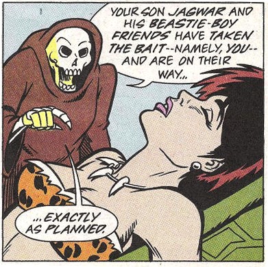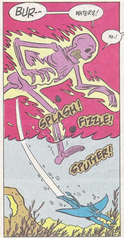 brûlant les arbres aux alentours. Les compagnons avaient une idée, le conduire à une rivière. Jagwar en connaissait justement une à proximité ! Man Ray l’attirait en l’insultant. Plongeant dans l’eau, il se débarrassait de son adversaire, qui n’avait pas vu qu’il se dirigeait dans l’eau. Pendant que les Mutanimals fêtaient leur victoire, Screwloose restait pensif. Ces morts n’avaient rien de bien dangereux. Pas même le géant. Il se demandait s’il ne s’agissait pas plutôt d’un simple contretemps…
