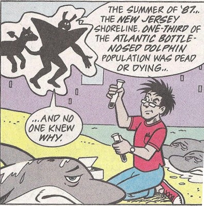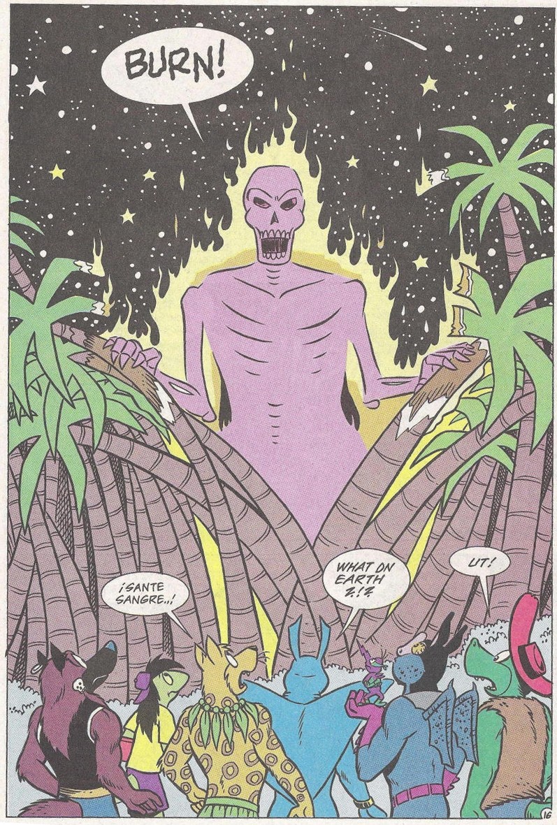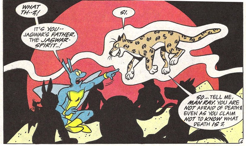 Une fois encore, Man Ray se montrait dubitatif. Ils devraient faire face à la mort. Mais qu’est-ce que cela pouvait-il signifier ? Ils devraient passer par la mort pour trouver leur voie ? Il ne la craignait pas, puisqu’il ne savait pas de quoi il s’agissait. C’est alors qu’il vit l’esprit du Jaguar s’approcher de lui, lévitant dans le ciel. La créature lui faisait quitter son corps pour lui faire vivre une expérience astrale. Ils remontaient tous deux le temps jusqu’en 1987, du temps où Man Ray était encore un humain du nom de Jack Finney. Il venait d’obtenir son diplôme et cherchait à sauver une population de dauphin qui s’était échouée sur les rives du New Jersey, victime d’un mal inconnu. Il se moquait des conséquences. S’il allait mourir ou non. Il voulait seulement les sauver. L’année suivante, il était transformé en mutant après avoir analysé une boue visqueuse qui se déversait des égouts dans le fleuve (TMNT A. #5). Il avait affronté la mort à plusieurs reprises dès lors, face à Mossback (TMNT A. #17), Scul et Bean (Mighty Mutanimals mini-series #2). Mais Man Ray n’avait pas le temps d’en dire plus à l’esprit du Jaguar, qui saisit sa queue pour le ramener dans son corps. Il sentait un grand danger, ils devaient revenir à eux.