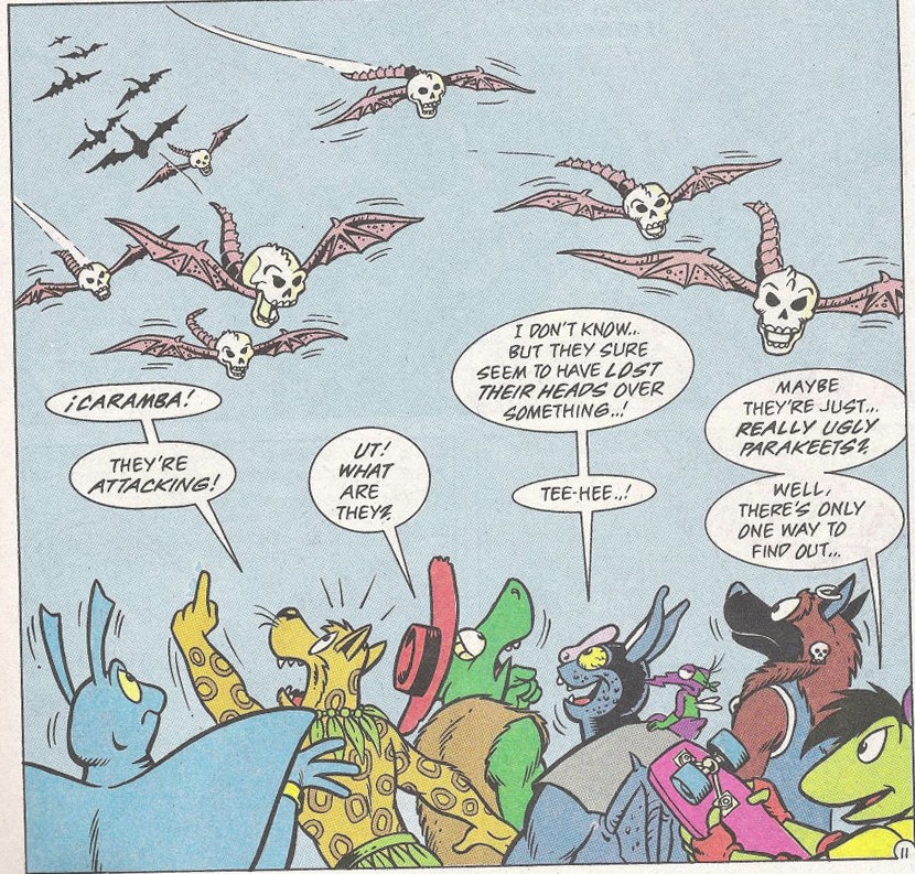 Une nuée de petites créatures volantes s’approchaient. Il s’agissait de crânes humains avec des ailes de chauves-souris. Les compagnons se lançaient au combat. Ils n’avaient aucun mal à venir à bout des créatures, mais l’une d’elles s’empara de Screwloose, l’emportant dans les airs. Le petit moustique parvenait à se défaire de la créature et tombait dans les mains de Leatherhead.