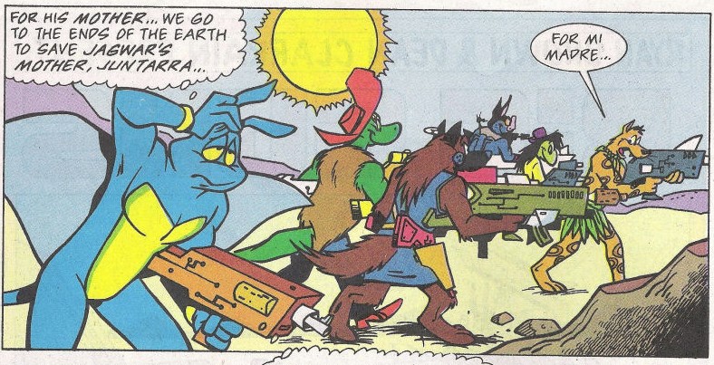 - Une très grosse erreur que le comic répétait inlassablement depuis l’introduction de Jagwar était de faire parler ses personnages vivant au Brésil en espagnol. Cette erreur est pointée du doigt par Kid Terra et « justifiée » par Juntarra par le fait que ses parents étaient des missionnaires espagnols.