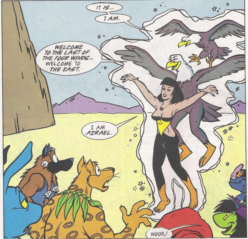 Après plusieurs jours de marche, l’équipe voyait un pygargue à tête blanche voler en leur direction. Il s’agissait bien de celui qui avait prévenu Juntarra du danger qui la guettait (Mighty Mutanimals #1). S’approchant des compagnons, l’animal prenait forme humaine du nom d’Azrael. Mais au moment de se présenter et de leur annoncer qu’elle venait les aider à retrouver Juntarra, Man Ray s’évanouit. Non loin de là se trouvait une grotte avec un petit lac interne. L’étrange femme les y conduisait. L’homme poisson y était déposé. Au bout de quelques heures, il se trouvait revigoré.