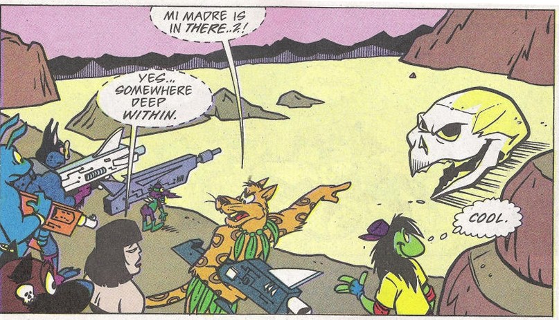 Une fois les forces de Man Ray entièrement recouvrées, le groupe pouvait reprendre sa route. Azrael les guidait jusqu’à la grotte au crâne où se cachait la faucheuse. Armes en main, les Mutanimals s’apprêtaient à entrer. Mais la jeune femme les retenait, leur conseillant d’attendre la tombée de la nuit. Ils n’avaient qu’à attendre une petite heure.