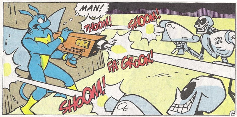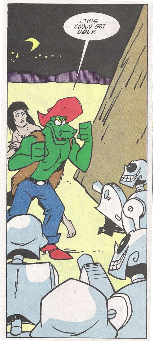 La nuit était tombée. Les Mutanimals s’apprêtaient à entrer armes à la main. Soudain, une voix familière les surprenait, perchée au sommet d’un rocher. Il s’agissait de M. Null, qui allumait un de ses fameux cigares. Il avait en sa compagnie six robots, eux aussi armés. S’avançant en direction des compagnons, ils faisaient feu. Répliquant, les Mutanimals étaient touchés les uns après les autres. Mondo Gecko, dans un élan de bravoure, parvint à en désactiver un, mais il ne restait