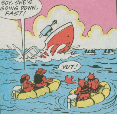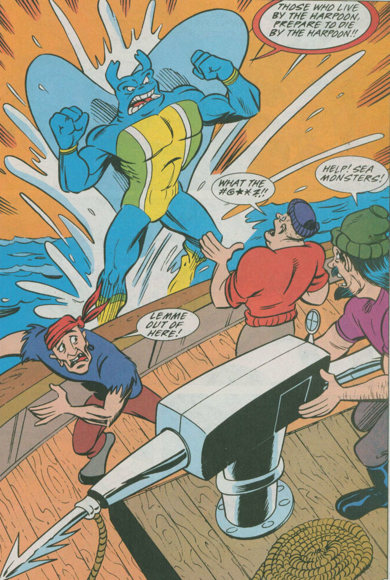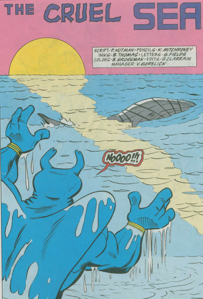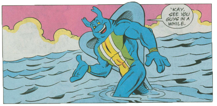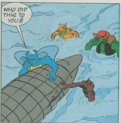 Les autres Mutanimals arrivaient peu de temps après pour prêter main forte à leur ami. Une fois tous les hommes neutralisés, le poisson mutant était arrêté net par une voix qu’il avait déjà entendue. Celle du capitaine Mossback. Deux ans en prison ne lui avaient pas suffi. Le pirate était bien décidé à prendre sa revanche sur celui qui l’avait emprisonné et ordonnait à ses hommes de lui tirer dessus. Ni une ni deux, Wingnut et Screwloose se jetaient sur les bandits pour les désarmer. Au même moment, le bateau s’encastrait dans des rochers. Les marins prenaient la fuite. Les Mutanimals en faisaient de même, regagnant leur zodiac. Dreadmon poussait l’homme poisson à les rejoindre et laisser le capitaine à son sort.
