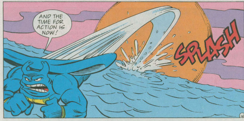 Quelques jours plus tard, l’équipe des Mighty Mutanimals se reposait sur la plage d’une île non loin de la côte brésilienne. Gecko prenait un bon bain de soleil tandis que Dreadmon confectionnait un château de sable. Man Ray proposait à ses amis de piquer une tête mais personne ne voulait l’accompagner. Se lançant seul dans l’eau, il était brutalement arrêté par une vision d’horreur. À quelques dizaines de mètres du rivage, il apercevait le corps d’une baleine, prisonnière d’un filet. Il se jetait à son chevet, terrifié par son sort. Les autres membres de