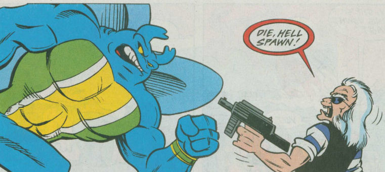 Man Ray nageait à toute vitesse, espérant qu’il ne soit pas trop tard. Le navire qui avait capturé les baleines appartenait à Mossback (TMNT A. #17). Ses hommes et lui réalisaient une vraie razzia dans les océans. Ils en étaient déjà à seize baleines en cinq jours. Et ils avaient encore deux jours de travail devant eux. L’homme poisson surgissait sur le pont du bateau, faisant peur à une grande partie de l’équipage qui s’empressait de prendre harpons, pagaies et autres armes de fortunes.