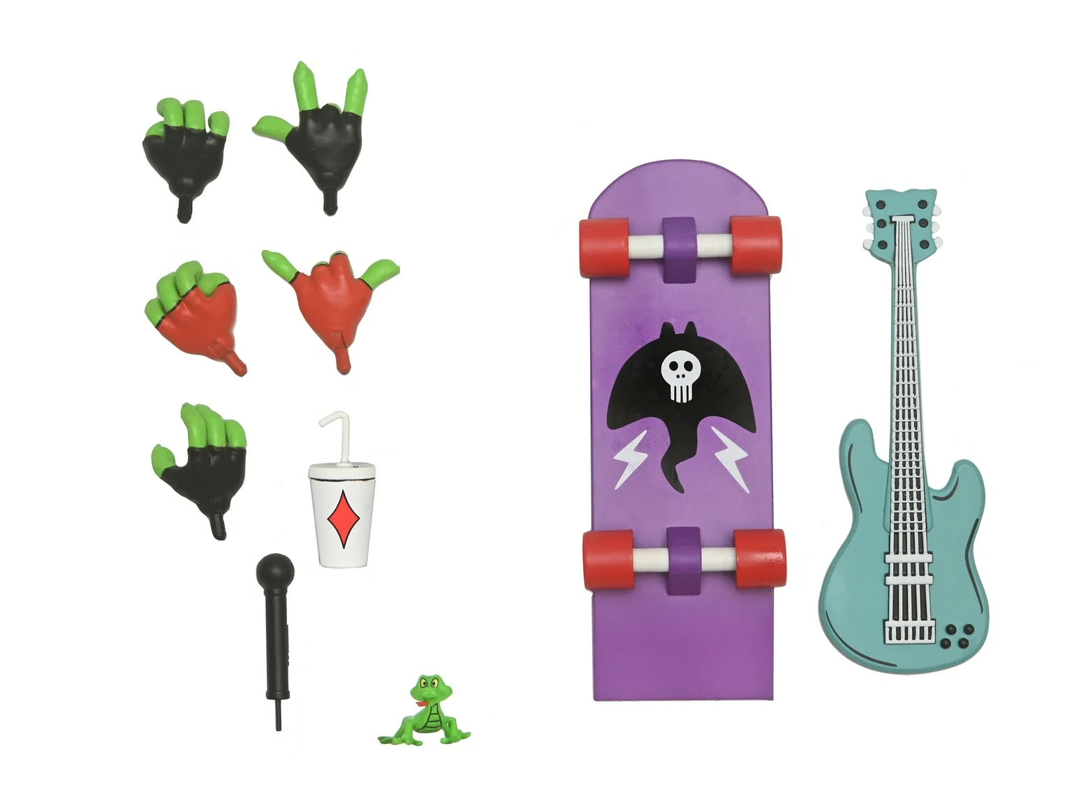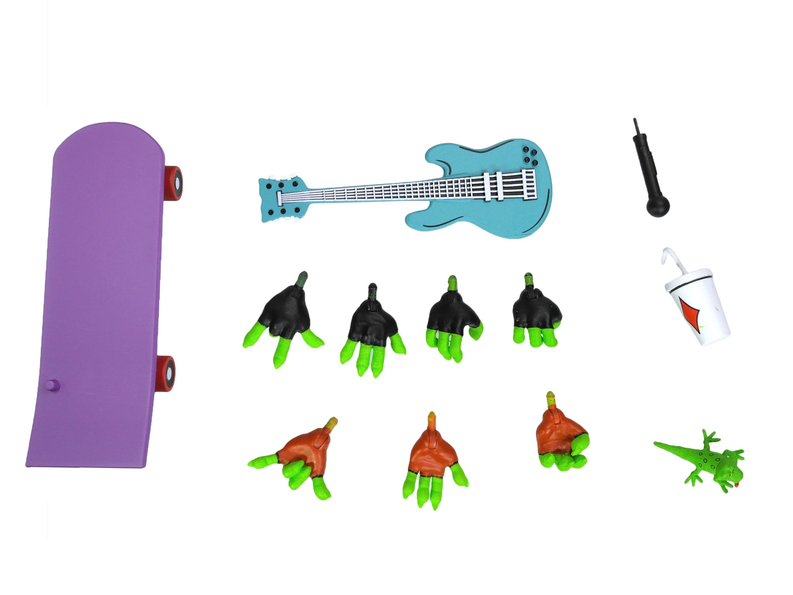 Mondo Gecko est accompagné d’un grand nombre d’accessoires. Trois paires de mains interchangeables, une main droite supplémentaire, sa planche de skateboard, une guitare, un micro, un gobelet avec paille, et un gecko.