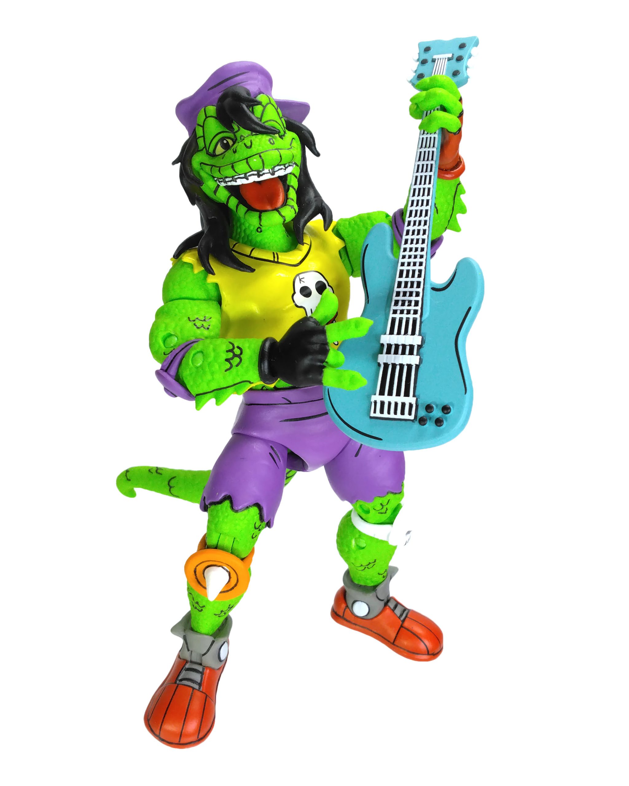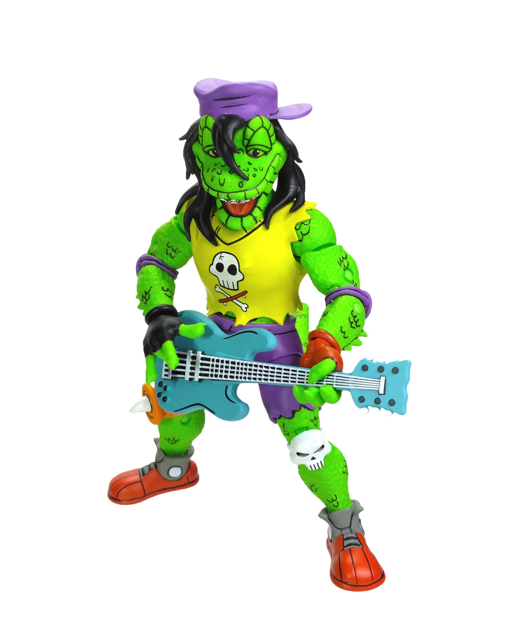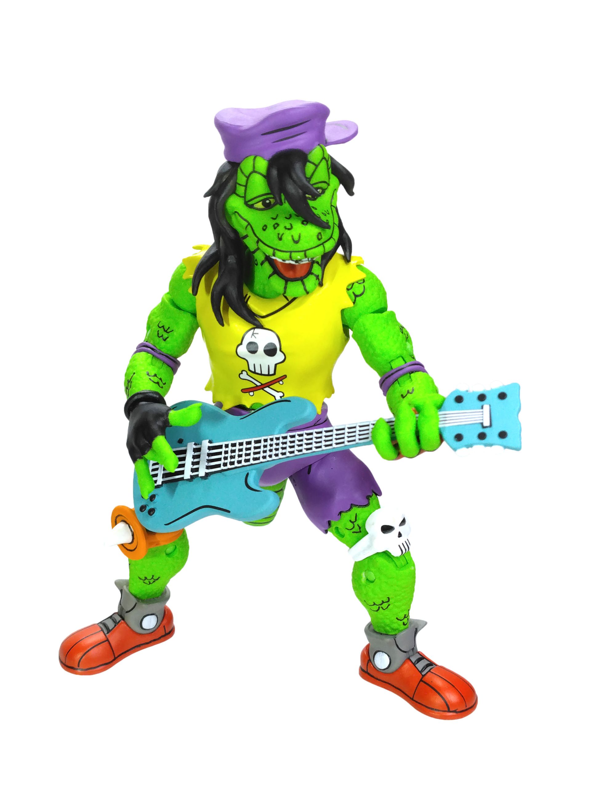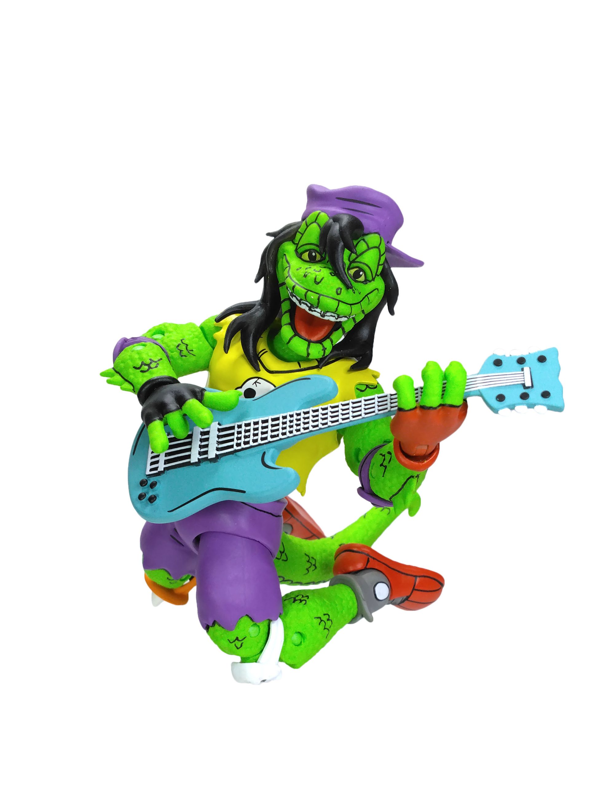 Côté accessoires, notre Gecko possède toute sa panoplie vue dans le TMNT A. #18. La guitare est excellente, les autres accessoires fourmillent de détails. On a même le petit gecko que l’on peut poser sur l’épaule du mutant.