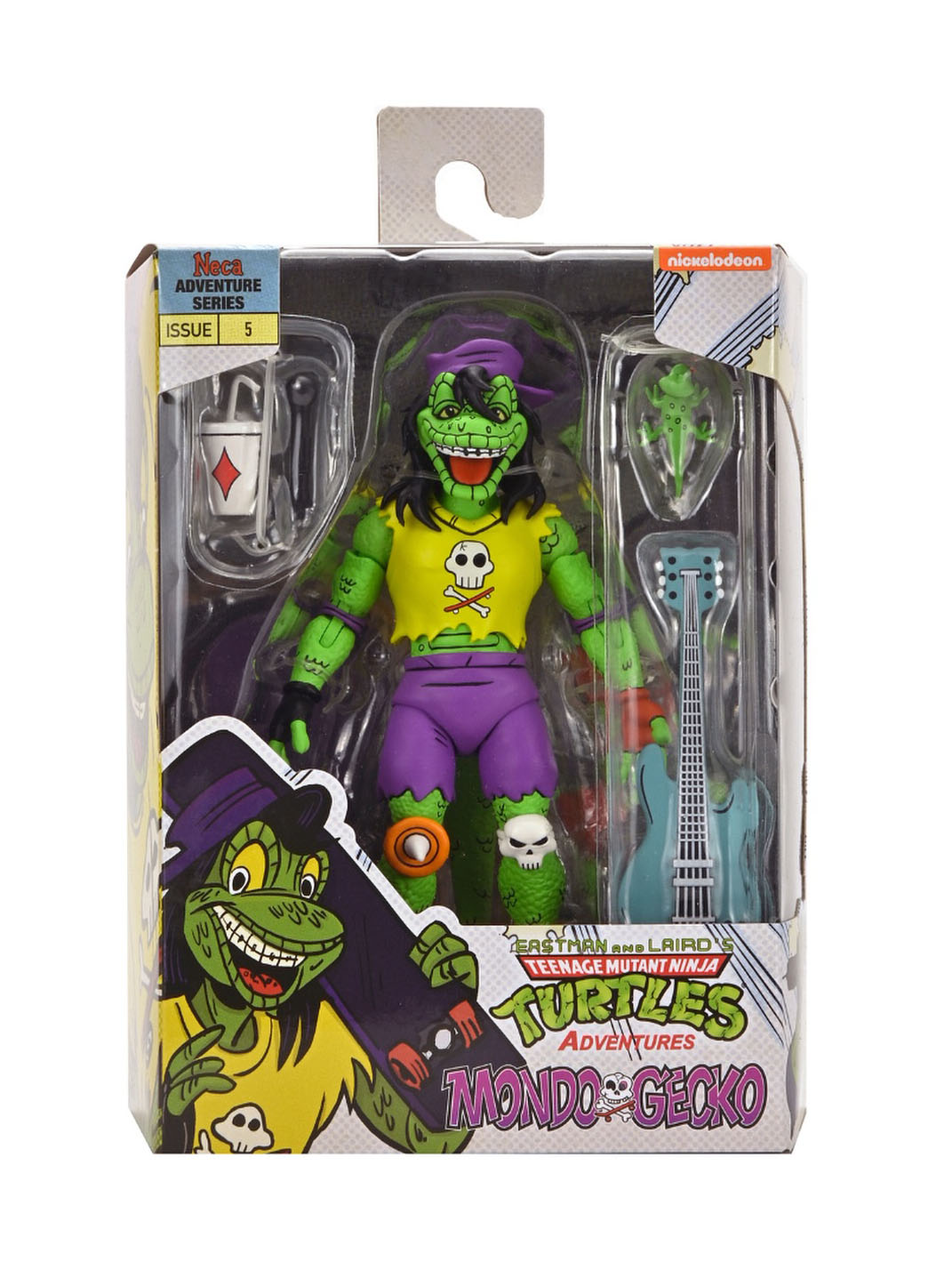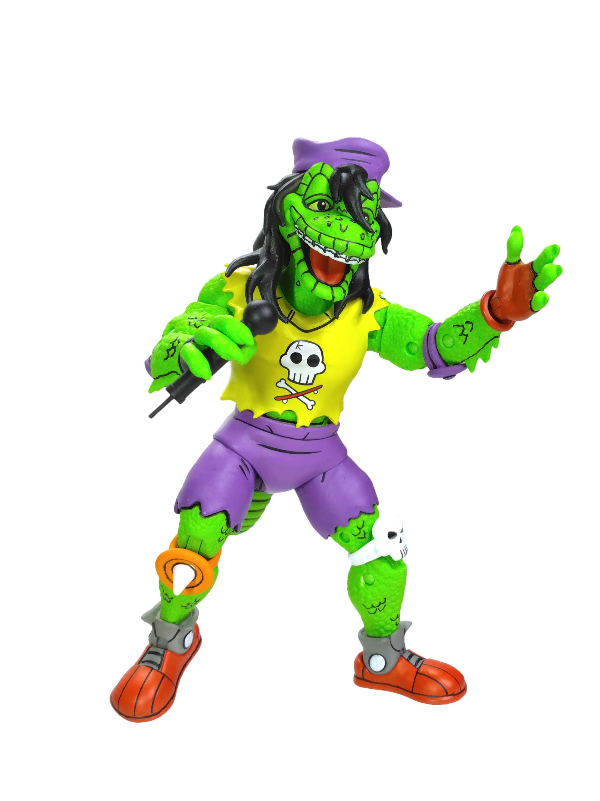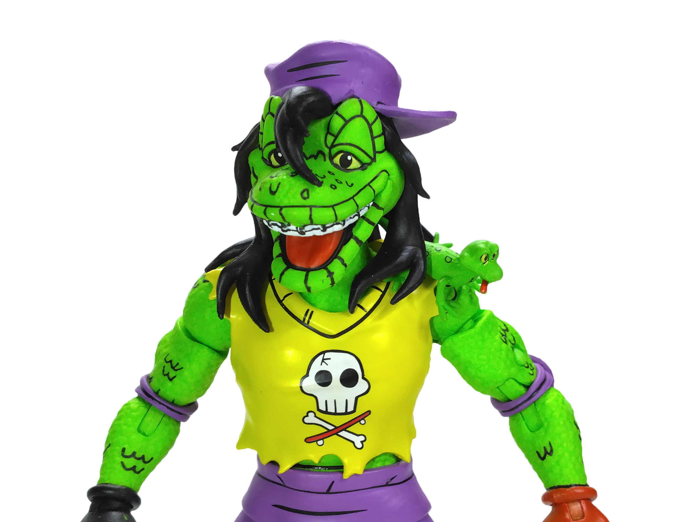 Côté accessoires, notre Gecko possède toute sa panoplie vue dans le TMNT A. #18. La guitare est excellente, les autres accessoires fourmillent de détails. On a même le petit gecko que l’on peut poser sur l’épaule du mutant.