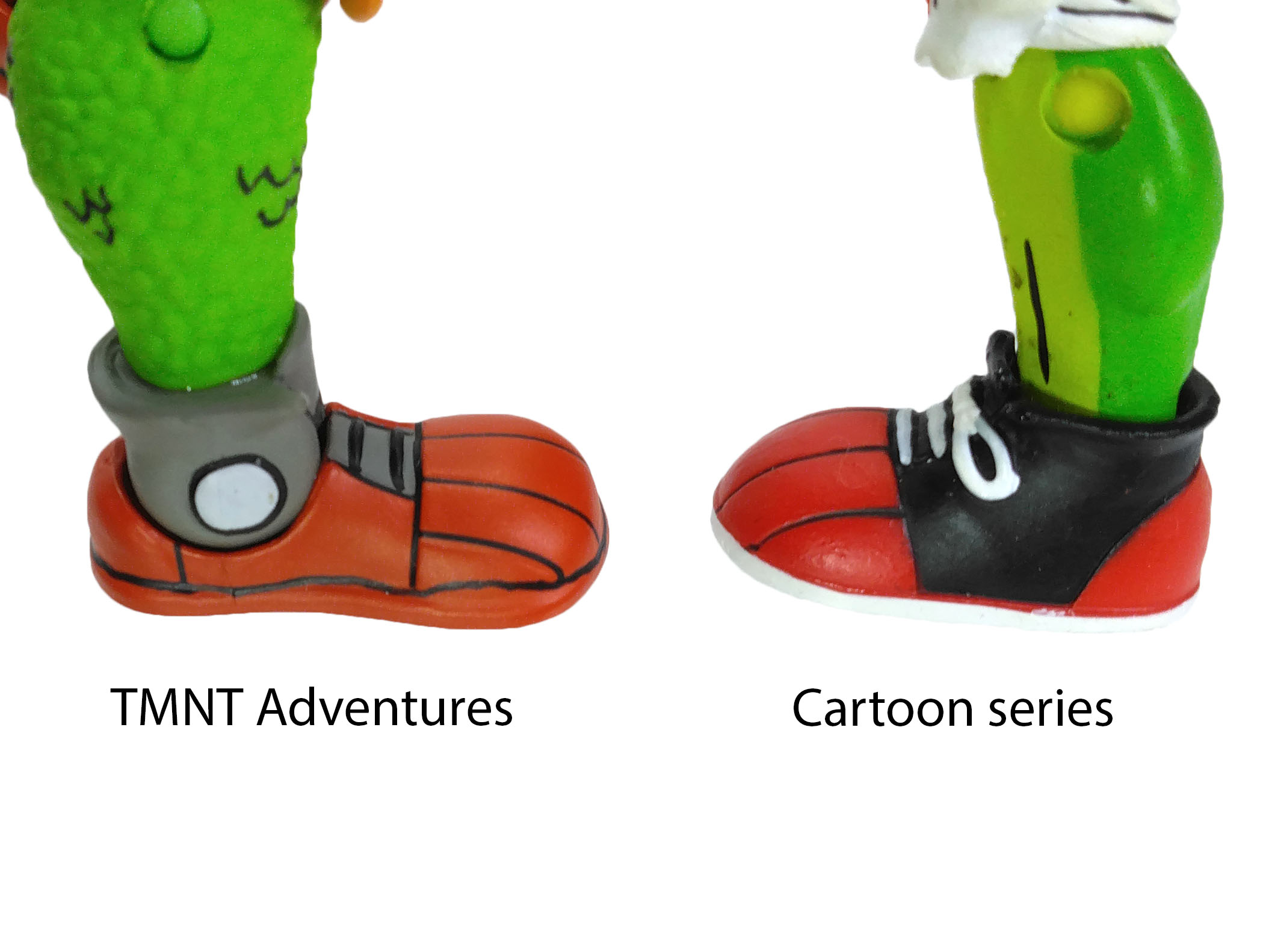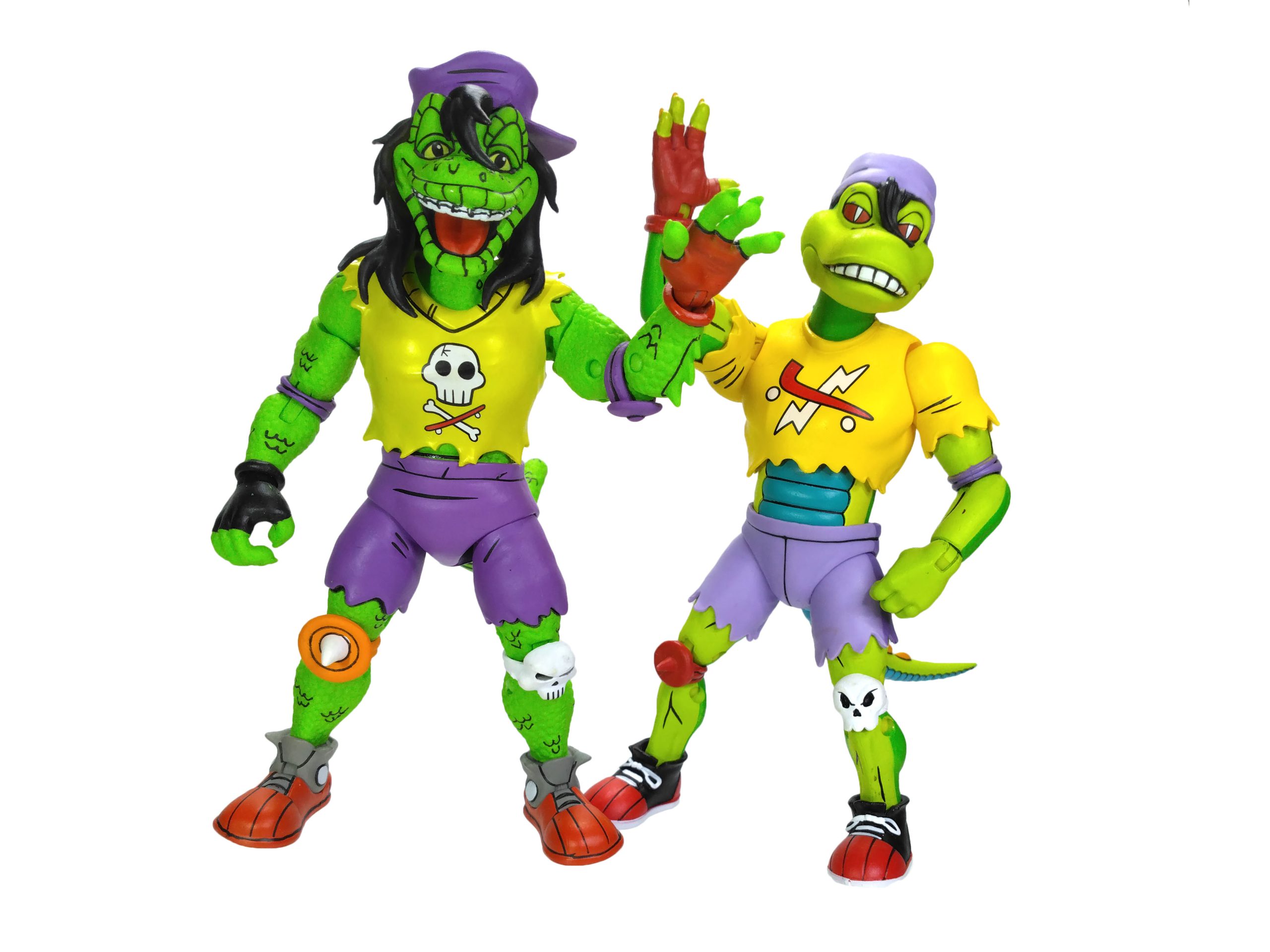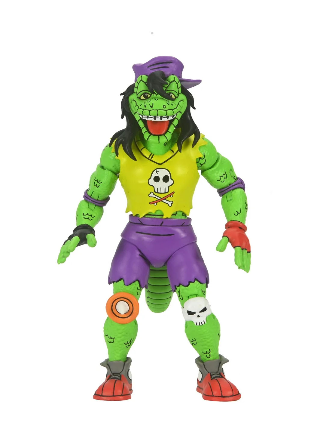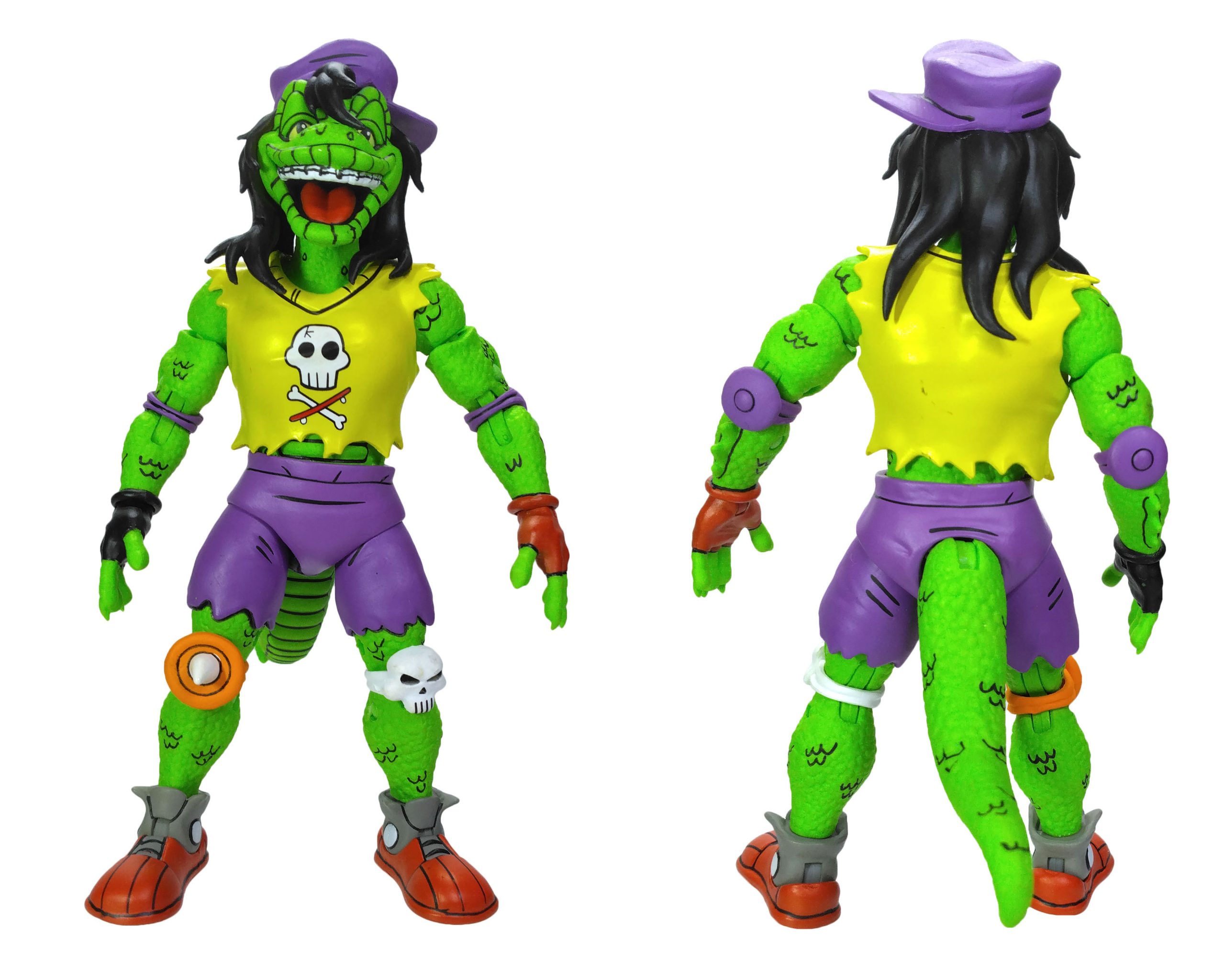 Le t-shirt de Gecko arbore la célèbre tête de mort avec le skateboard, que nous retrouvions déjà sur la figurine de Playmates sortie en 1990. Le logo est directement peint sur le vêtement et non collé. Enfin, nous retrouvons bien la couleur rouge pour le gant de la main gauche et le noir pour celui de la main droite.