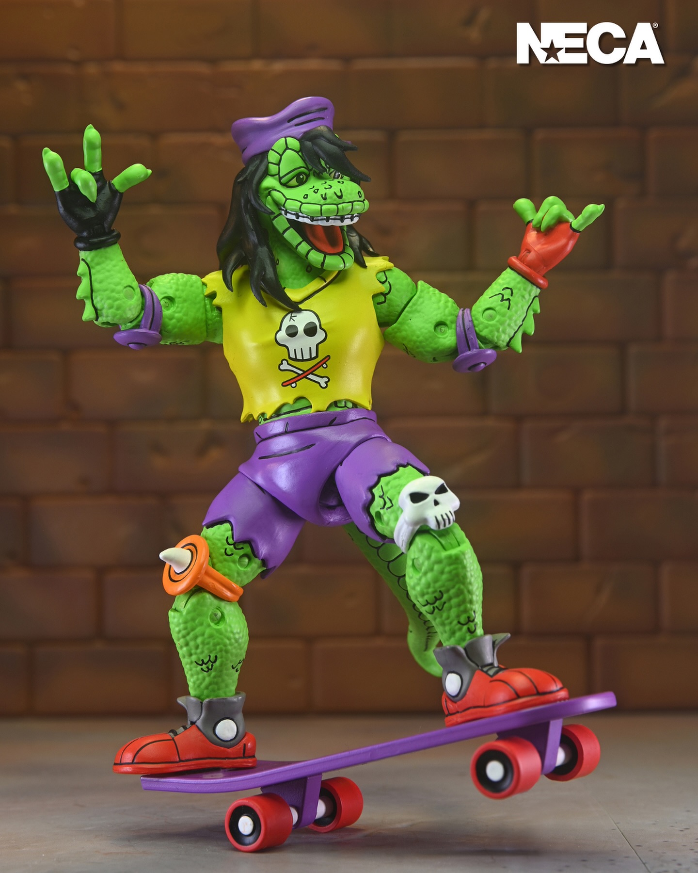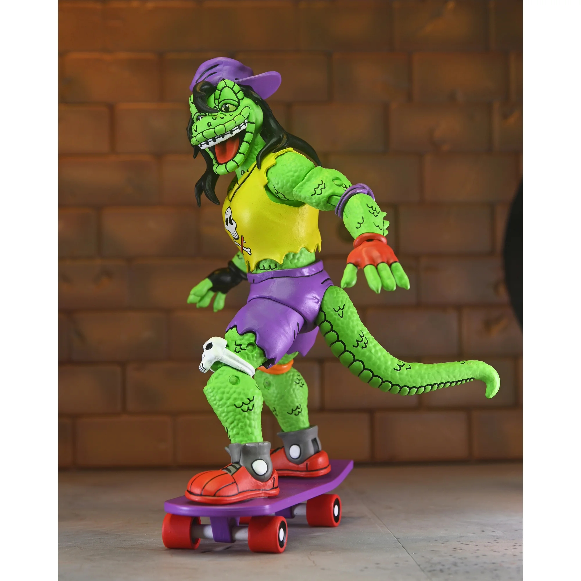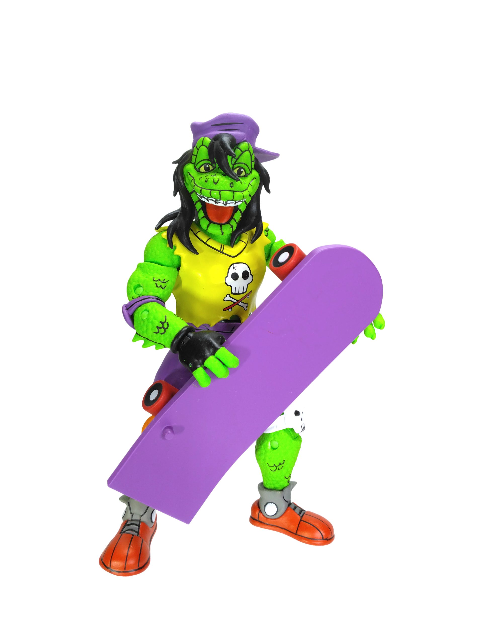 Le skateboard est entièrement violet et sans grands reliefs. Un petit peg permet de fixer la figurine, mais il est trop petit pour réellement se fixer au pied de Gecko. En-dessous nous retrouvons une décoration en forme de raie, comme dans le TMNT A. #18. Les roues fonctionnent bien.