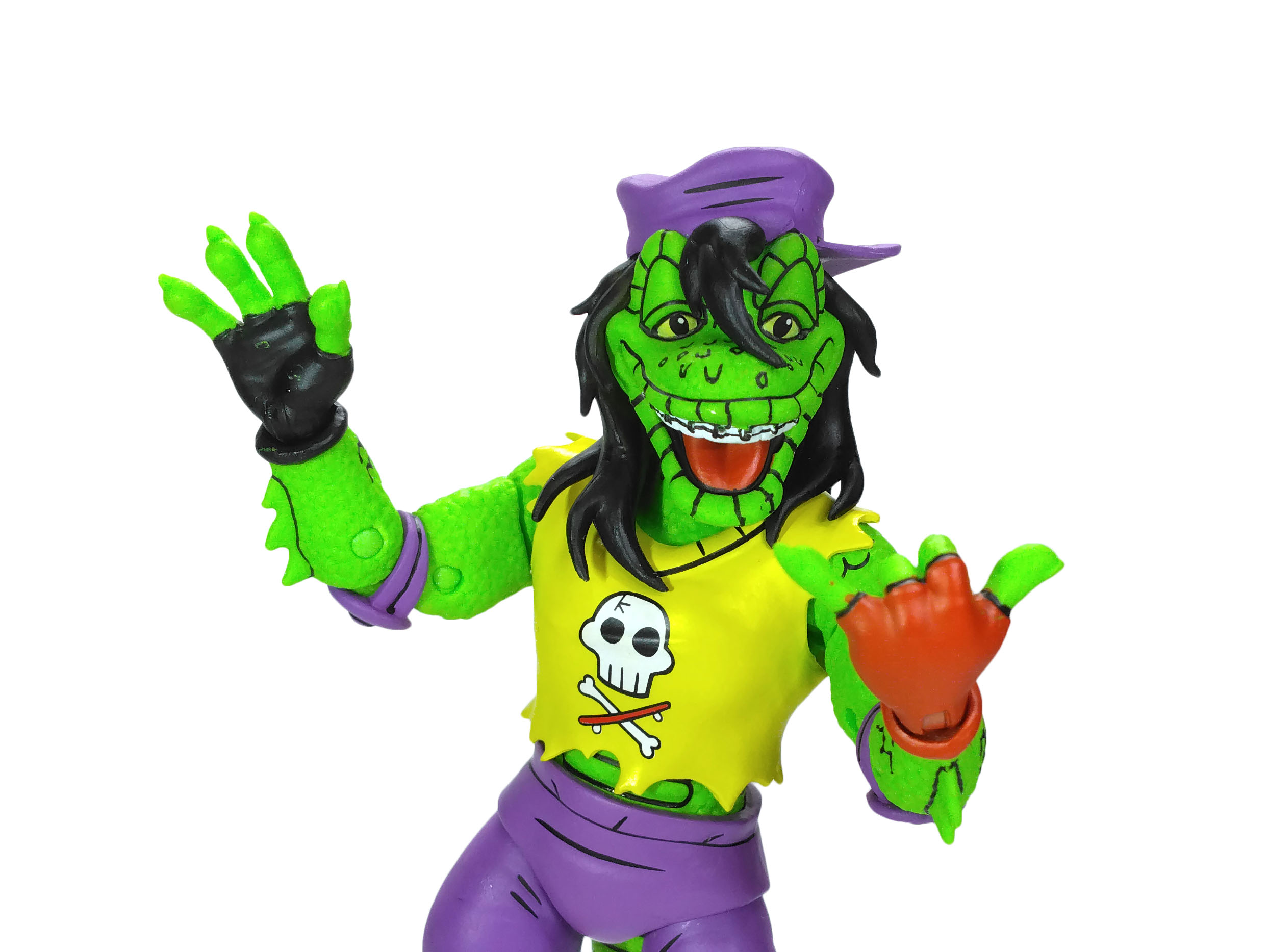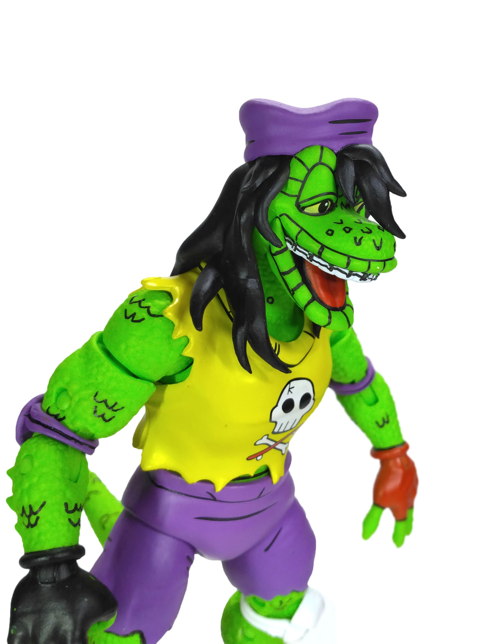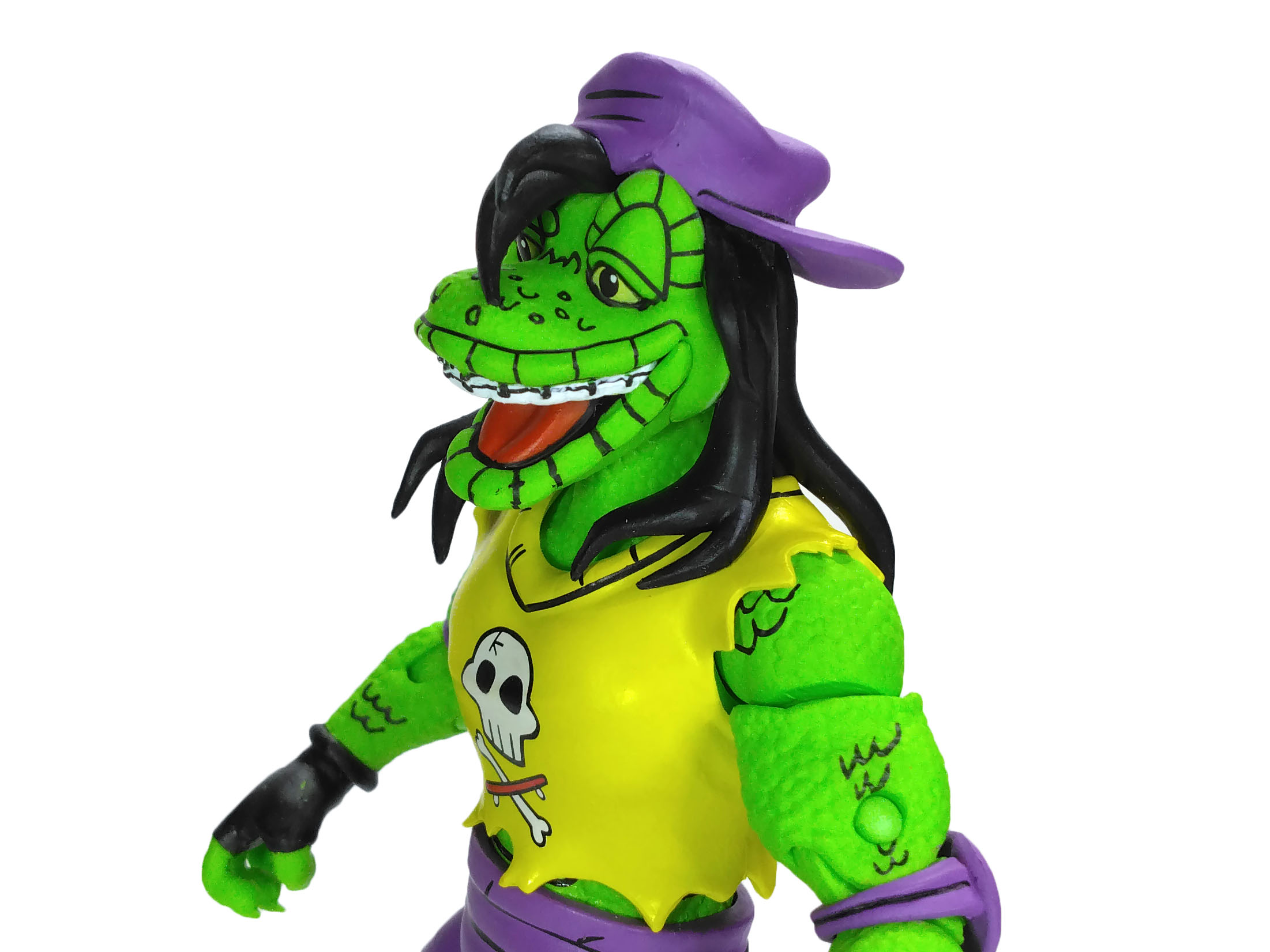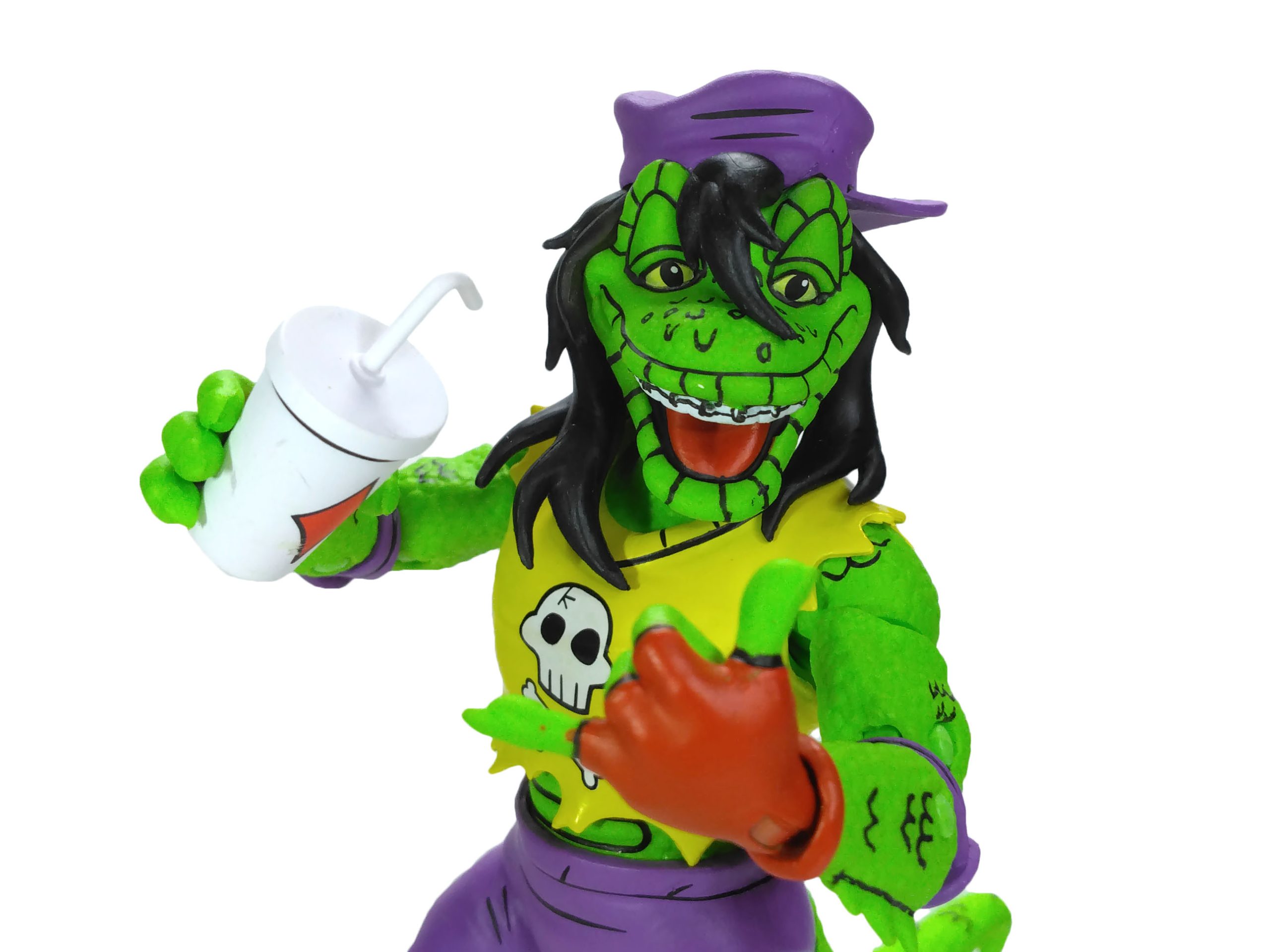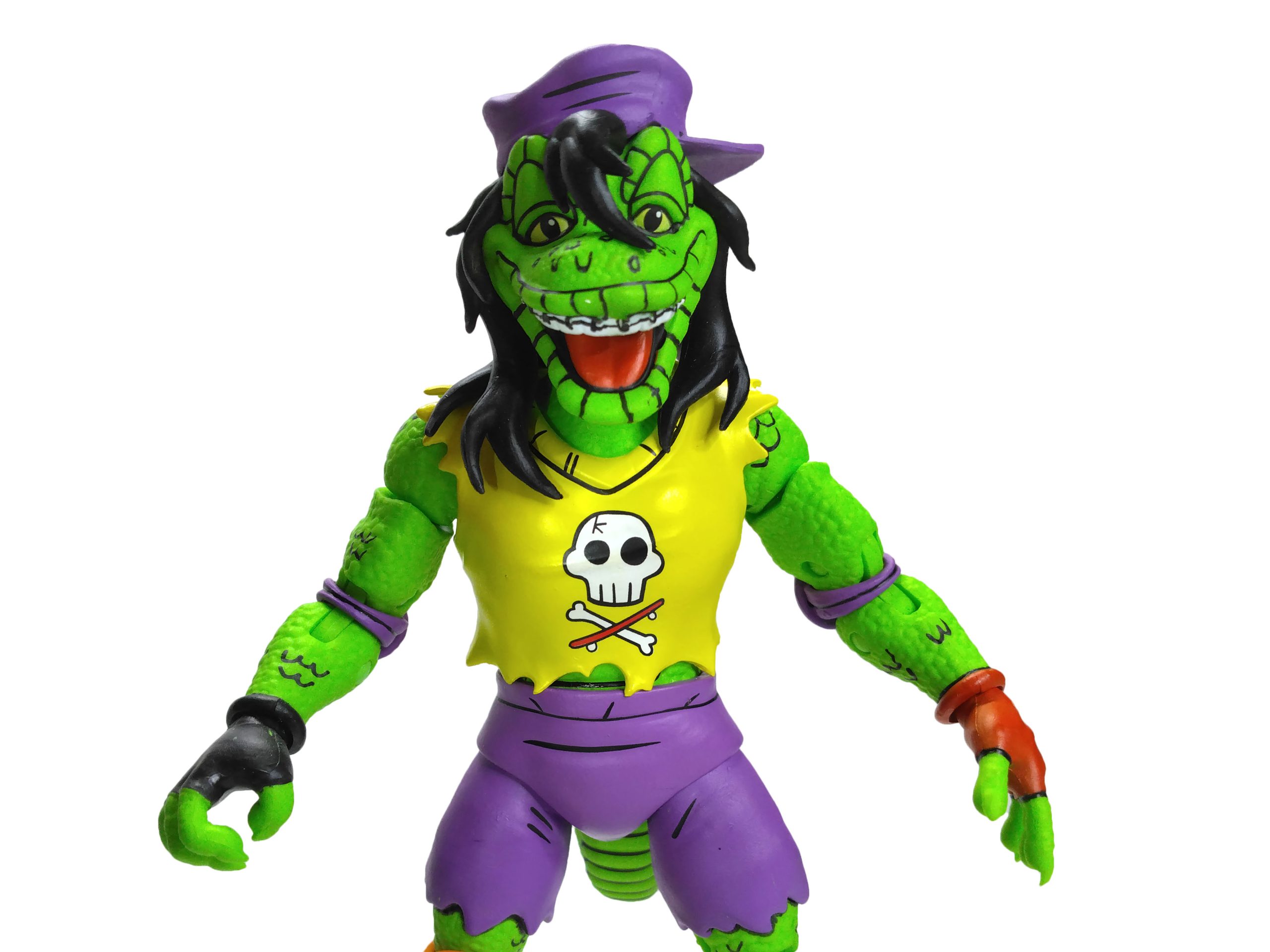 La totalité de la peau du gecko est sculptée avec une imitation d’écailles. Le rendu est très bon ! Le visage du mutant est très expressif, avec ce large sourire et ces yeux à demi ouverts, lui donnant un air de planer. Là encore, c’est un petit bijou de détails largement mis en valeur par la peinture. Même son appareil dentaire a été sculpté !