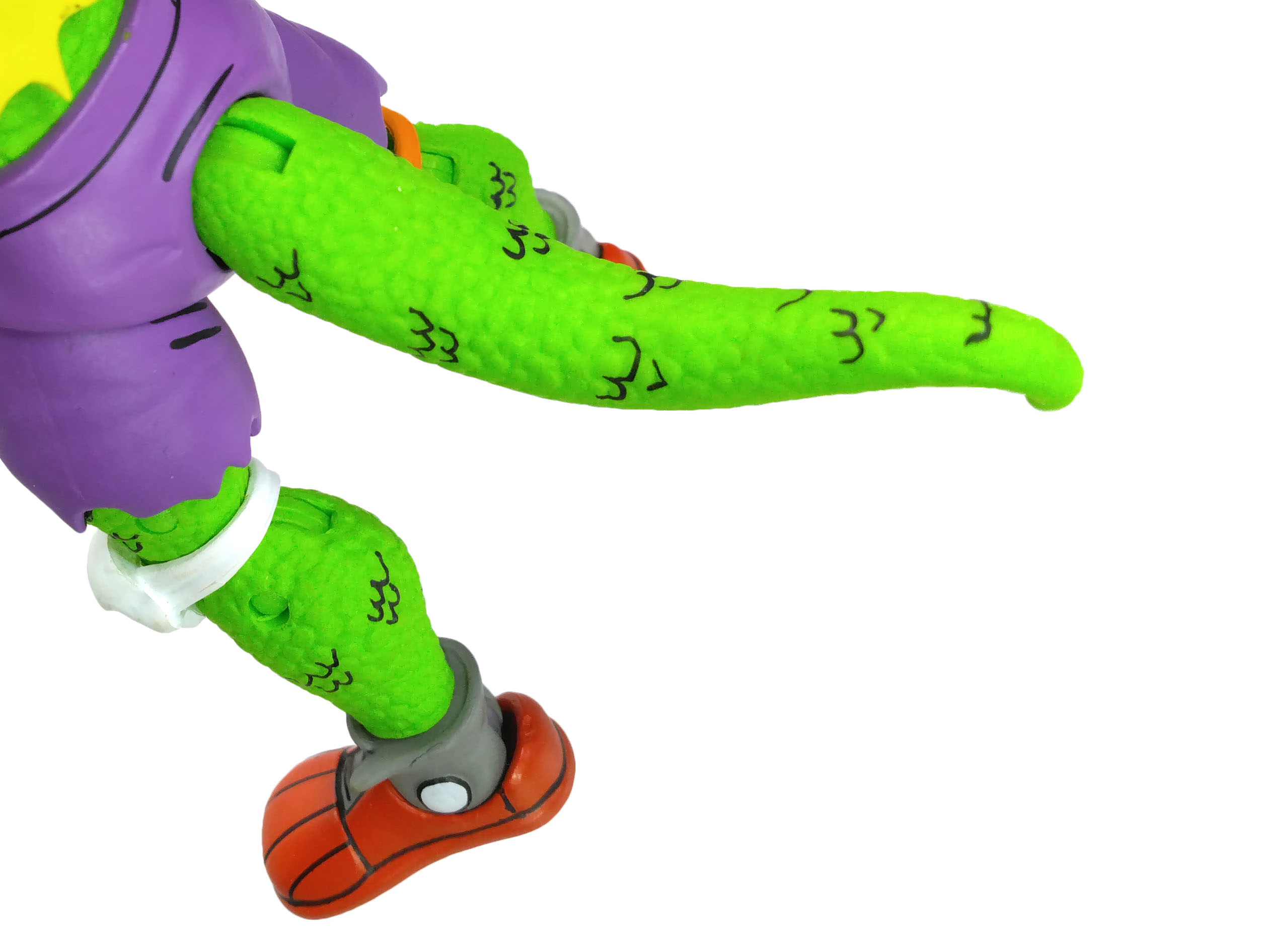 La queue ne possède pas de tige de fer pour la plier. Elle est trop petite pour ça. En revanche, j’ai un immense coup de cœur pour l’articulation des chevilles. ENFIN NECA nous propose des chaussures scindées en deux pour faciliter le mouvement de la cheville. J’ai si souvent critiqué l’absence d’une bonne articulation pour des figurines comme les Bebop de 2019, Mighty Hog ou encore Vacation Bebop (dont le modèle est très similaire).