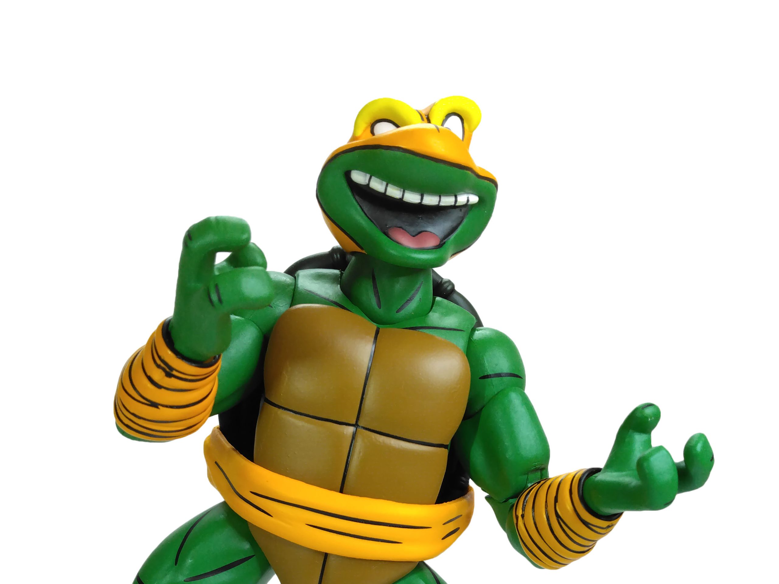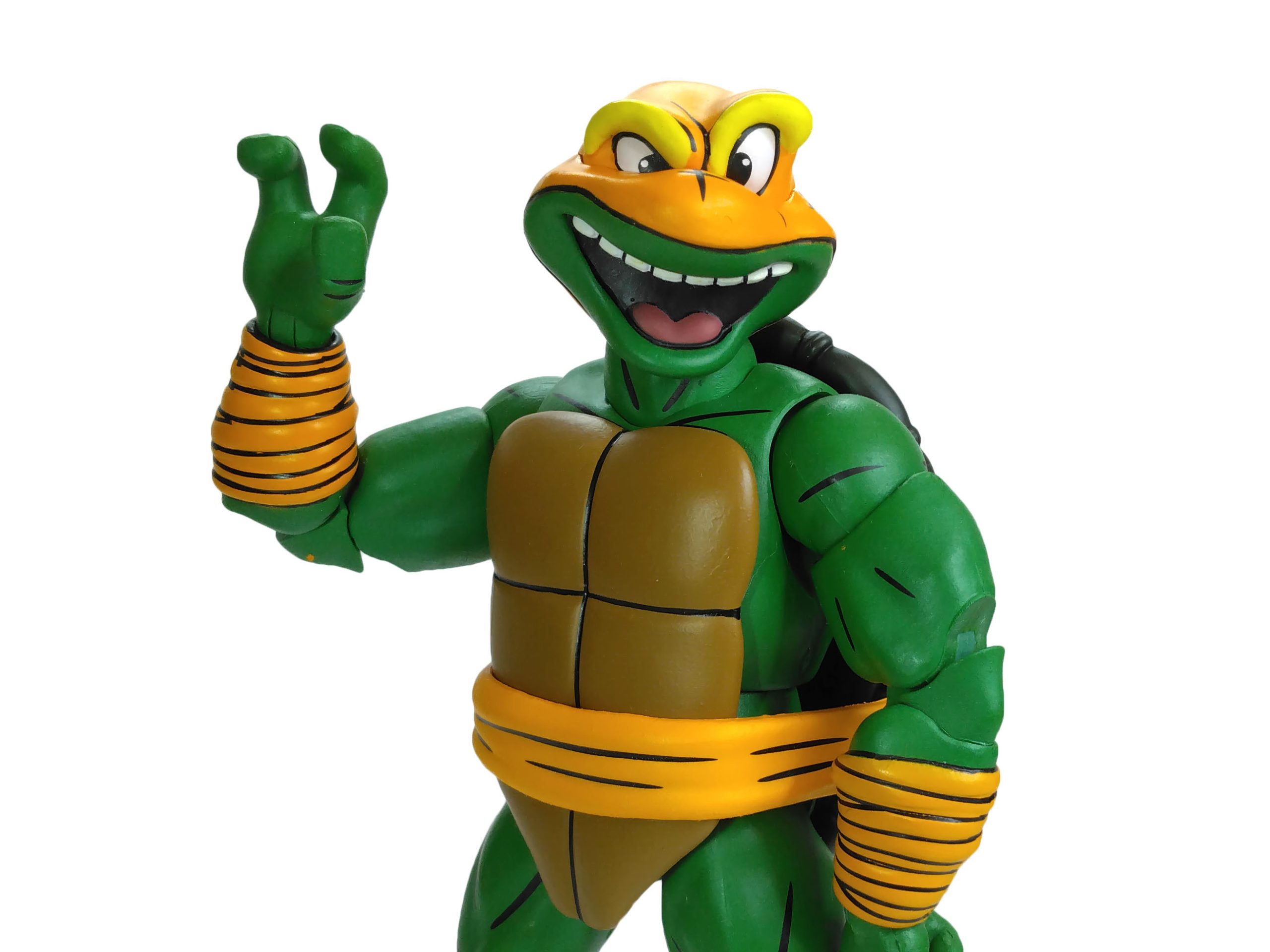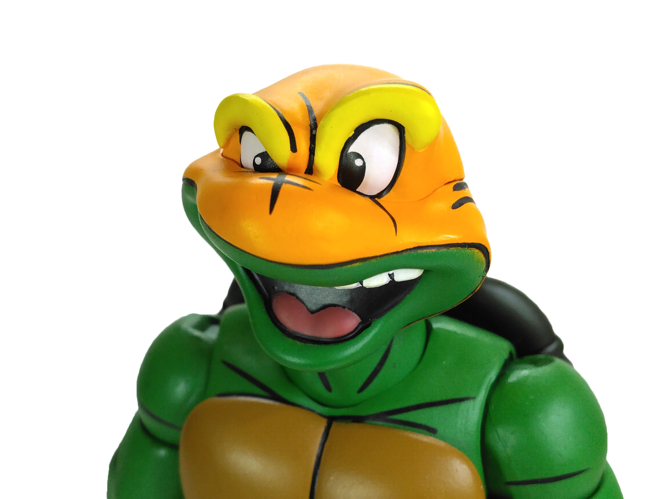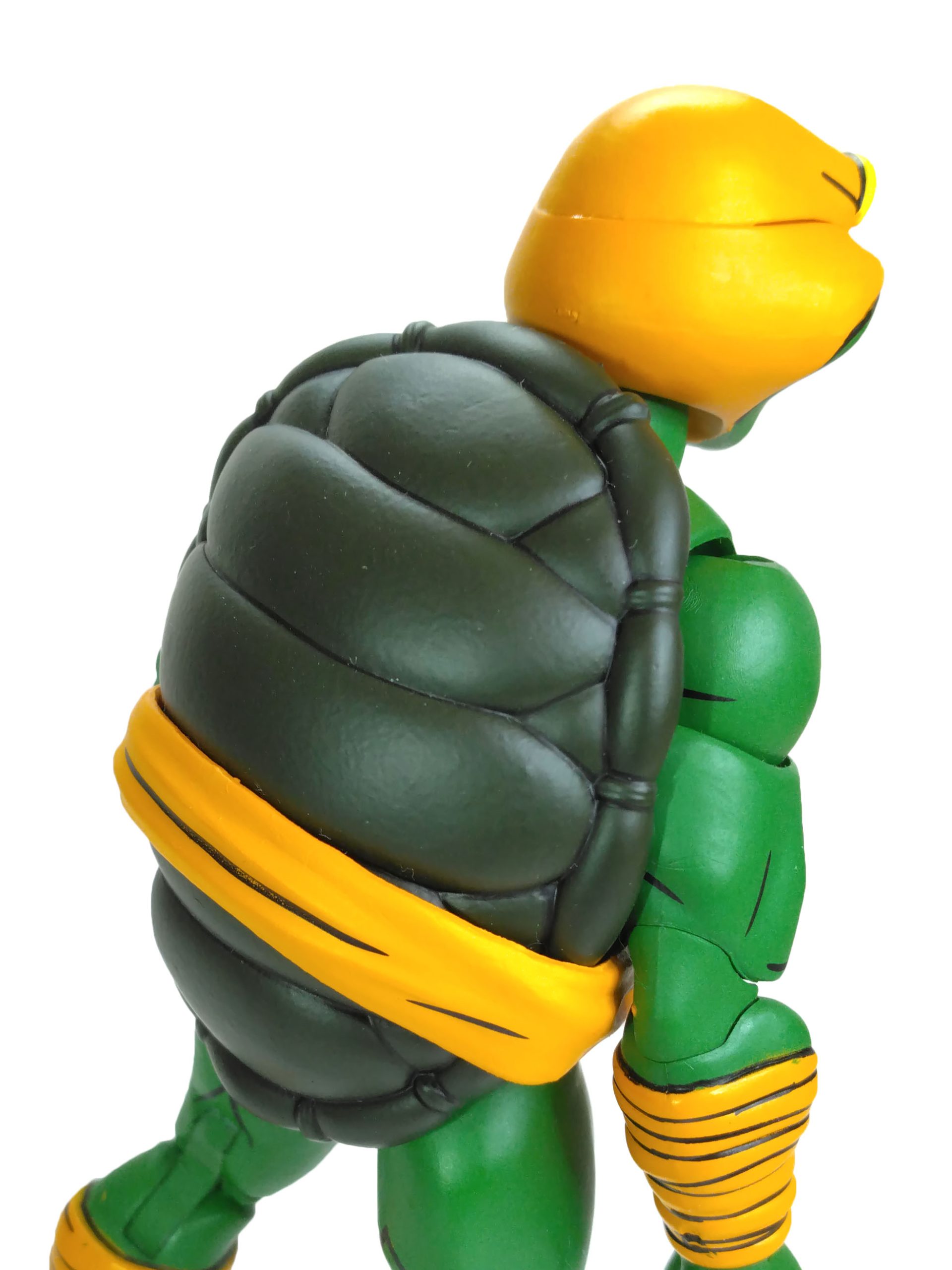 La sculpture générale du corps de Michelangelo est identique à celle des trois autres tortues. Celle-ci est totalement nouvelle, sculptée par Tony Cipriano et ne reprend en rien la sculpture des tortues du dessin animé de 1987. Cette figurine est d’ailleurs un petit peu plus grande et plus massive. Et j’ai un immense coup de cœur pour cette sculpture.